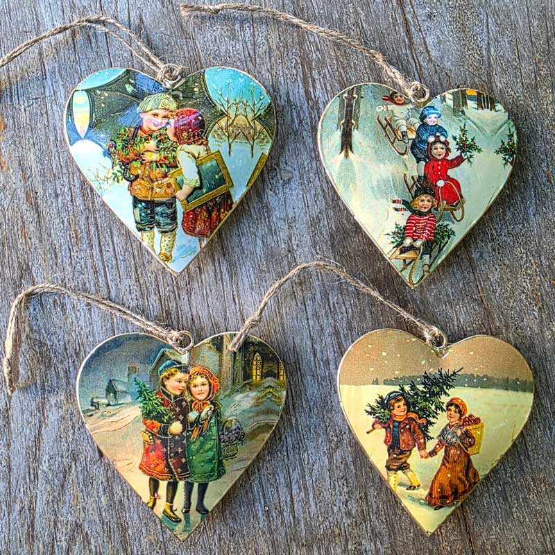 Christmas Metal Heart Ornament - Vintage Mistletoe Children