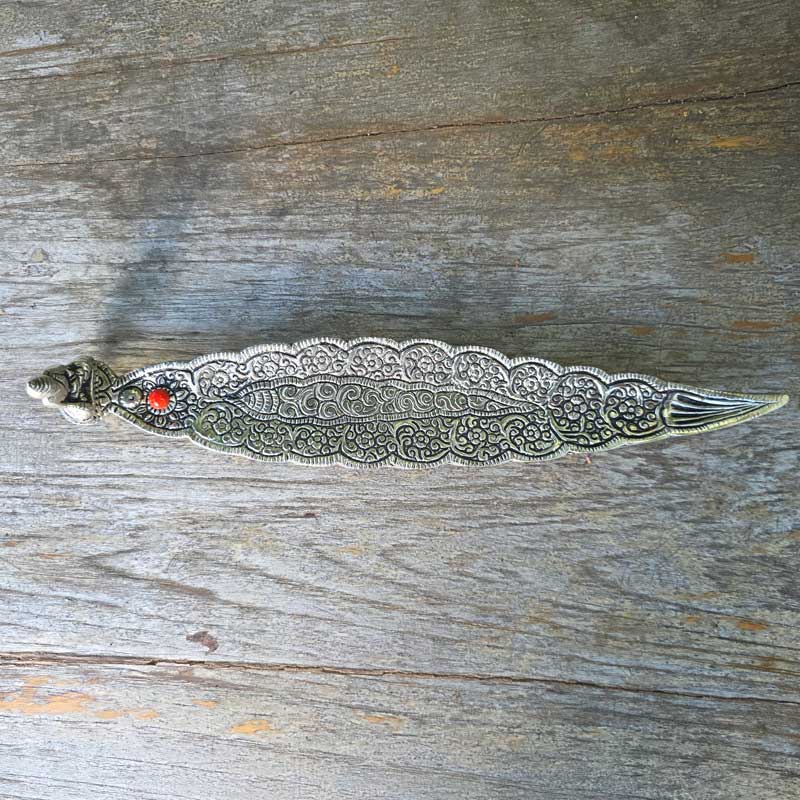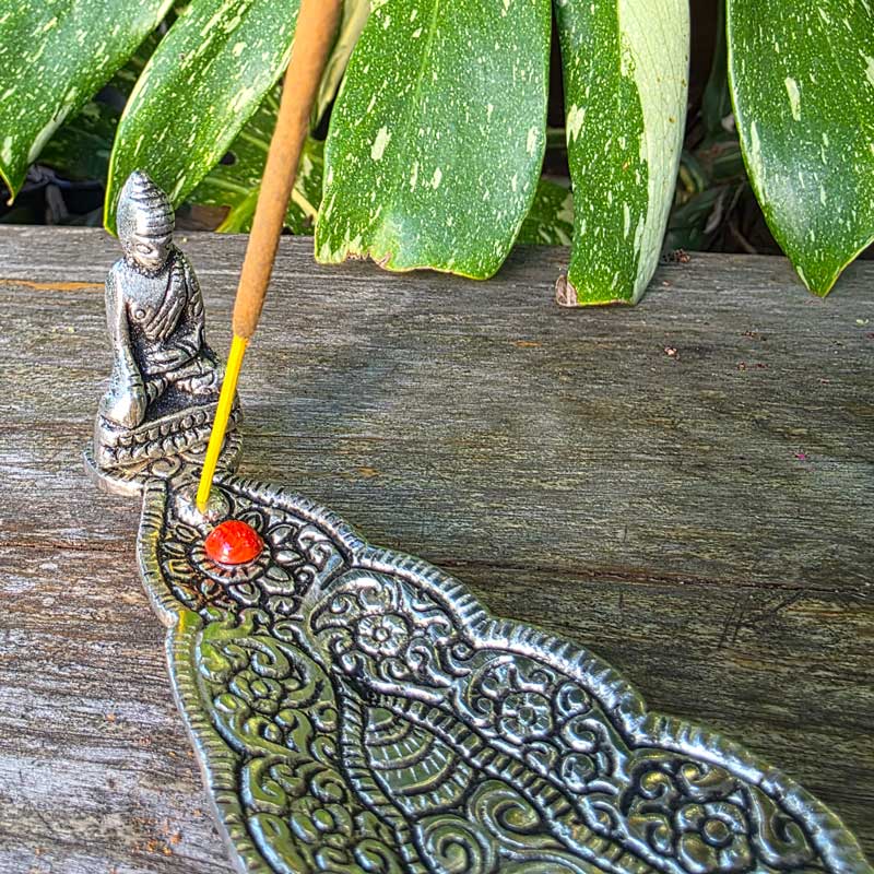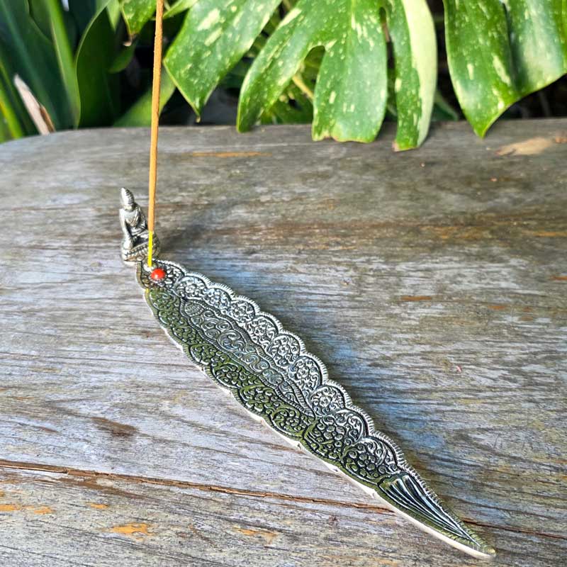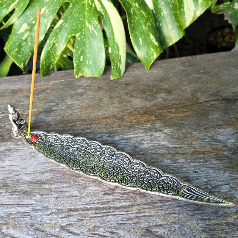 Burn your incense in style with this beautifully made incense holder. Crafted from aluminium and features a buddha at one end with intricate patterns across the length.