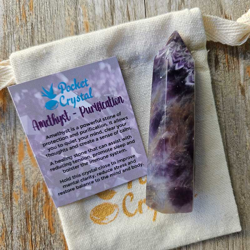 - Includes amethyst point wand crystal, card with crystal properties and meaning and fabric drawstring bag.