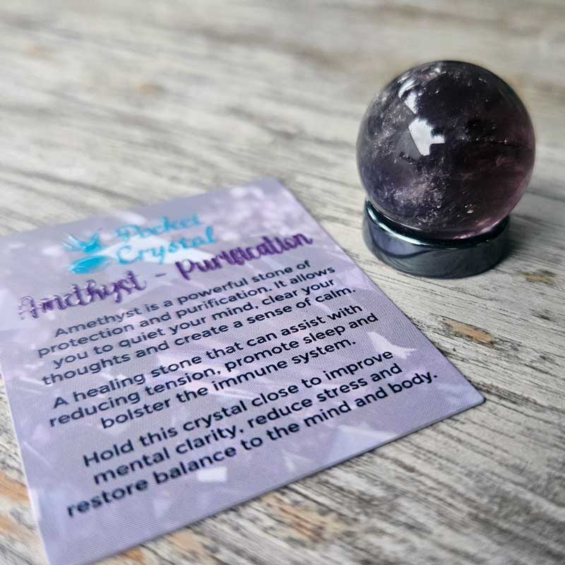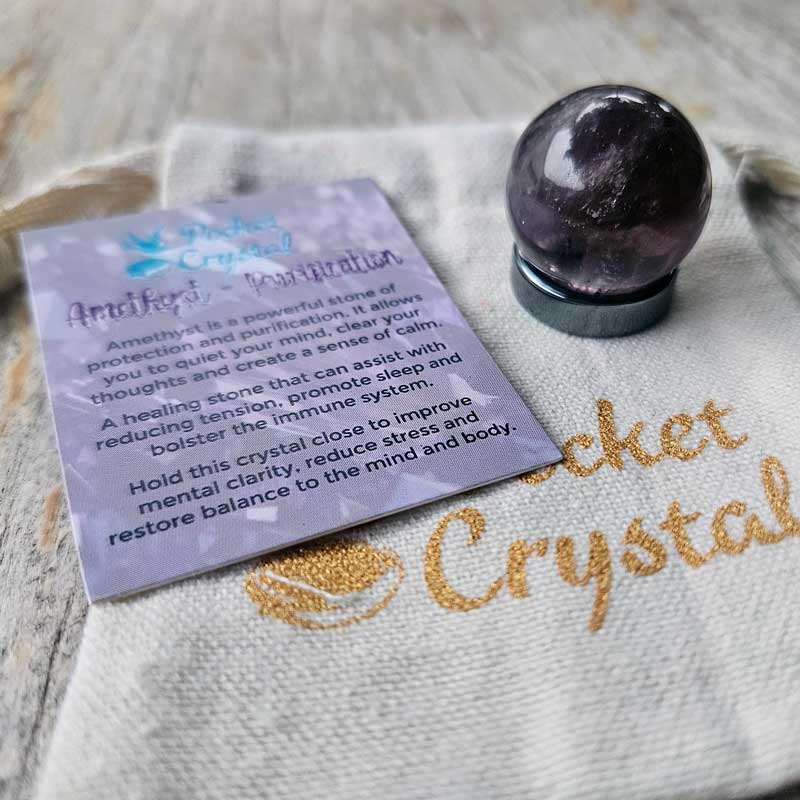 This beautiful Amethyst Pocket Crystal Sphere (with hematite stand) has been designed to be the ultimate pocket-sized meaningful gift for someone special.