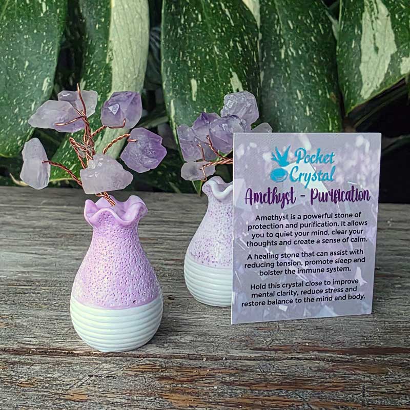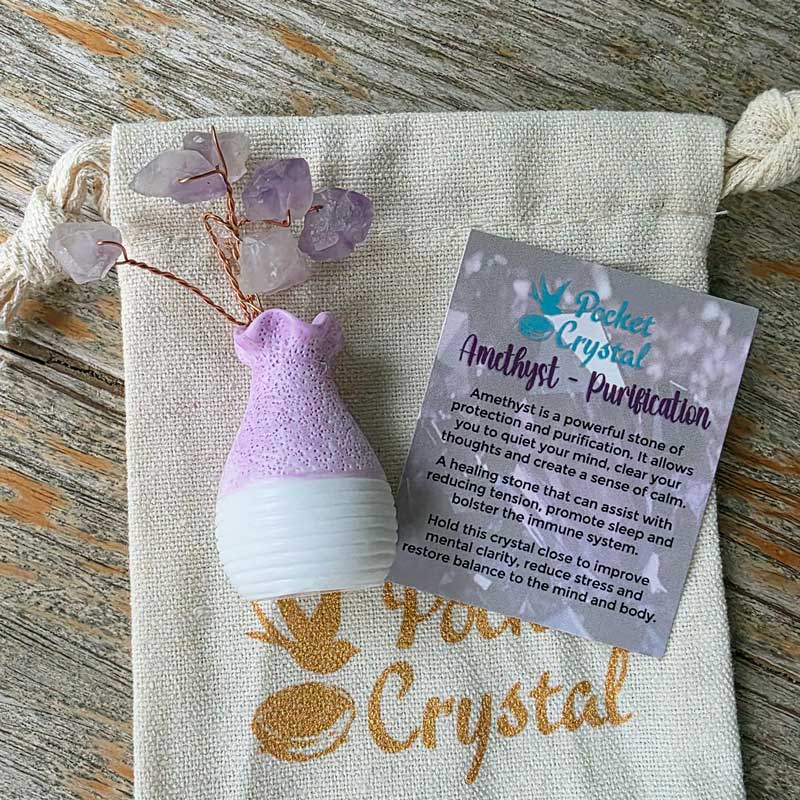 Includes a mini vase with tumble stone amethyst crystal flowers, a beautiful card with the crystal's unique meaning and properties, all within a matching bag.