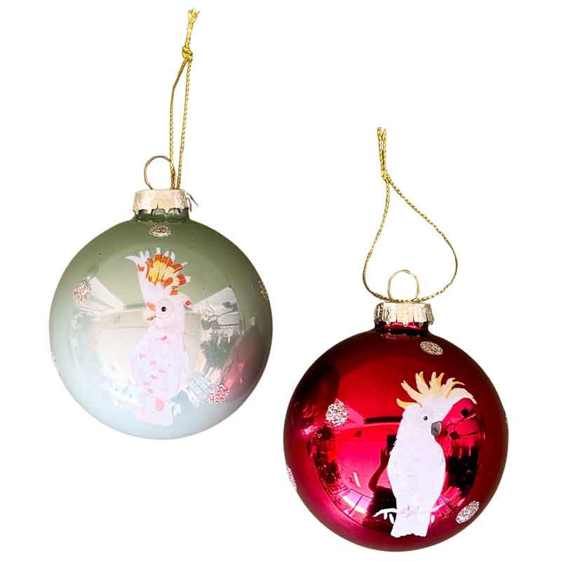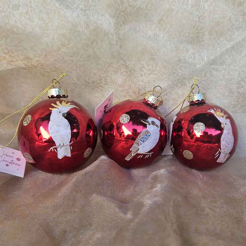 A lovely hanging Christmas bauble in an Aussie Bird design. Designed by Australia artist Frankie B. Each bauble has 3 birds featured on it - kookaburra, cockatoo and Major Mithchell's cockatoo so you can turn the bauble to whatever bird is your favourite. Makes a great gift for overseas family and friends.