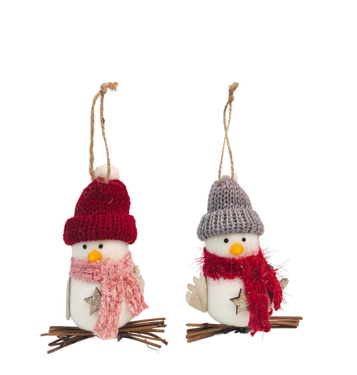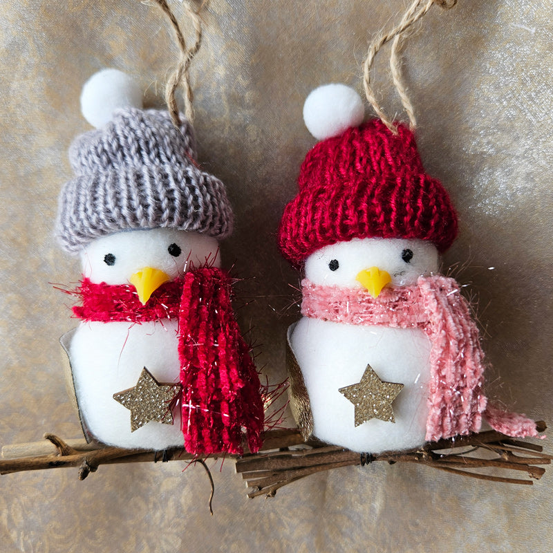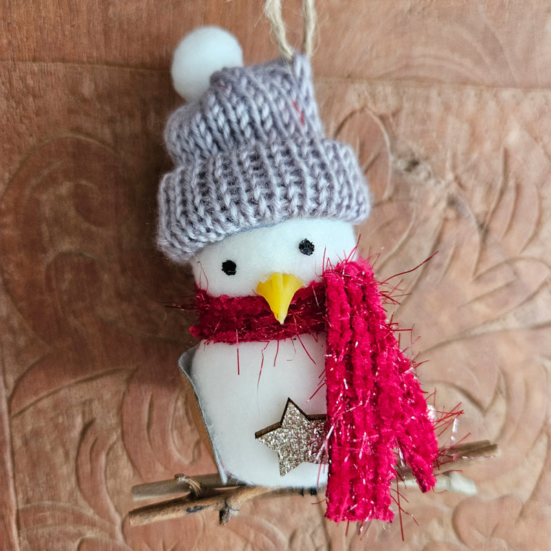 How cute is this little hanging bird on branch Christmas ornament! Features a knit scarf and beanie and is sweetly perched on a little branch, ready to hang from your Christmas tree.