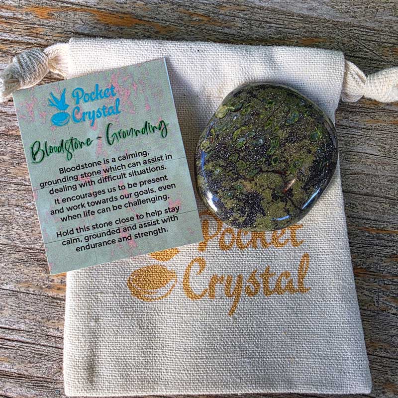 This beautiful Bloodstone Pocket Crystal Palm Stone has been designed to be the ultimate pocket-sized meaningful gift for someone special. A palm or worry stone is a smooth, polished crystal stone used for relaxation and a feeling of calm. Hold the stone between thumb and index finger and gently move the thumb back and forth across the surface. This soothing feeling is great for stress and anxiety relief.