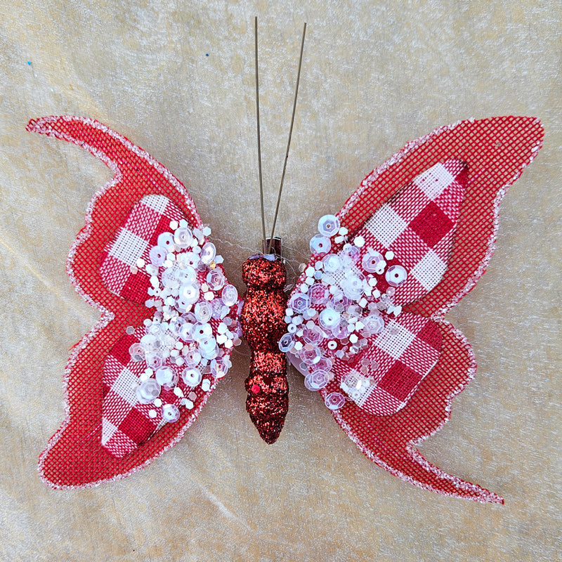 Butterfly Clip Fabric Ornament - Gingham Red/White