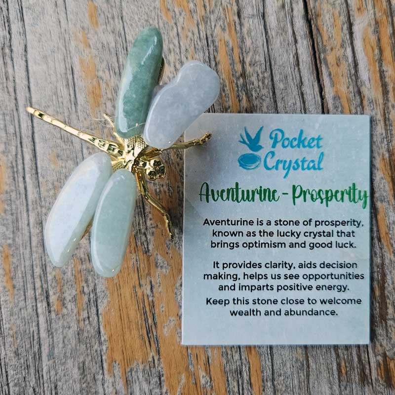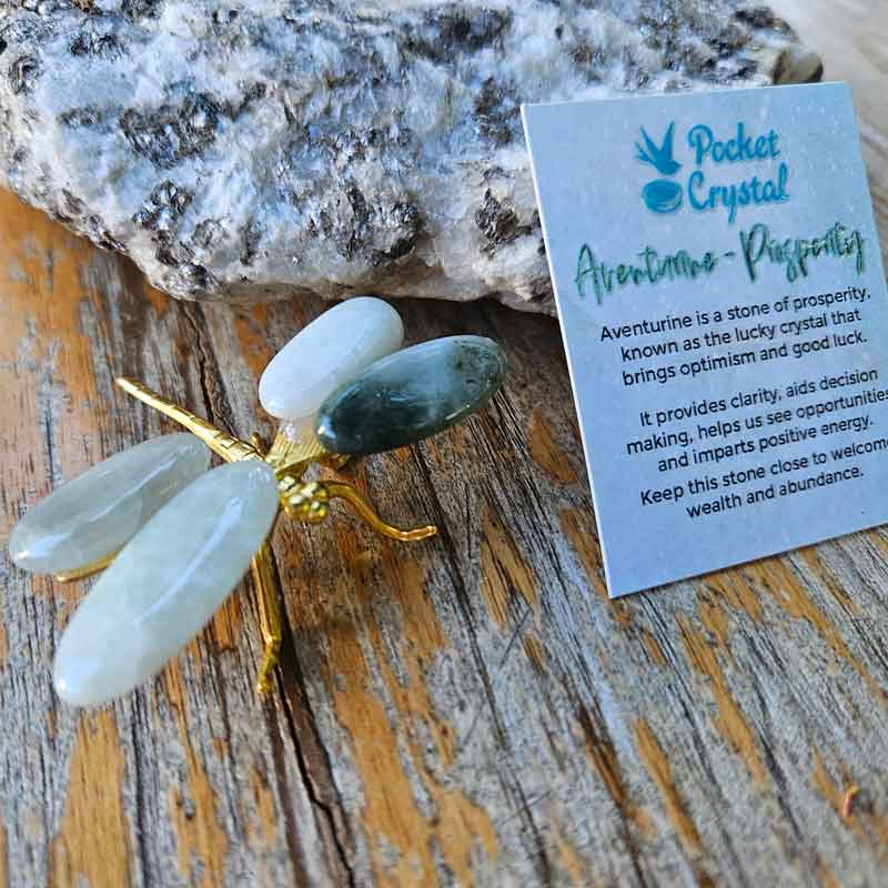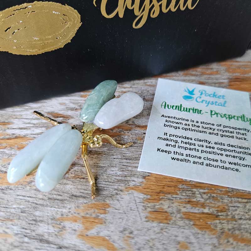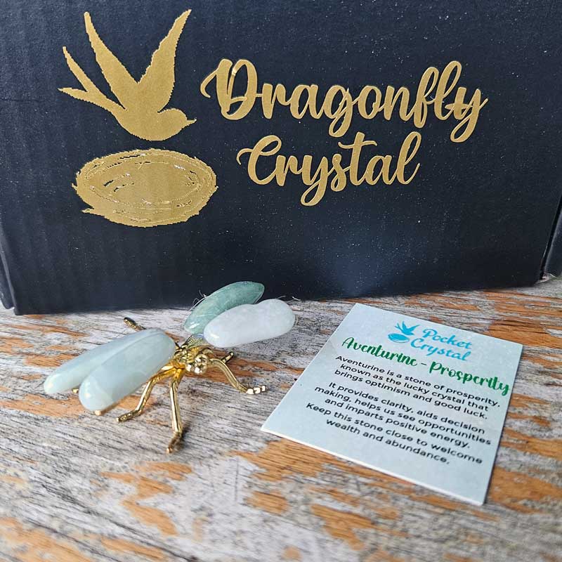 - Includes aventurine dragonfly crystal, card with crystal properties and meaning and gift box.