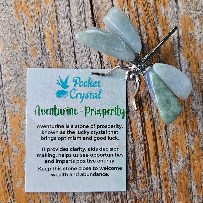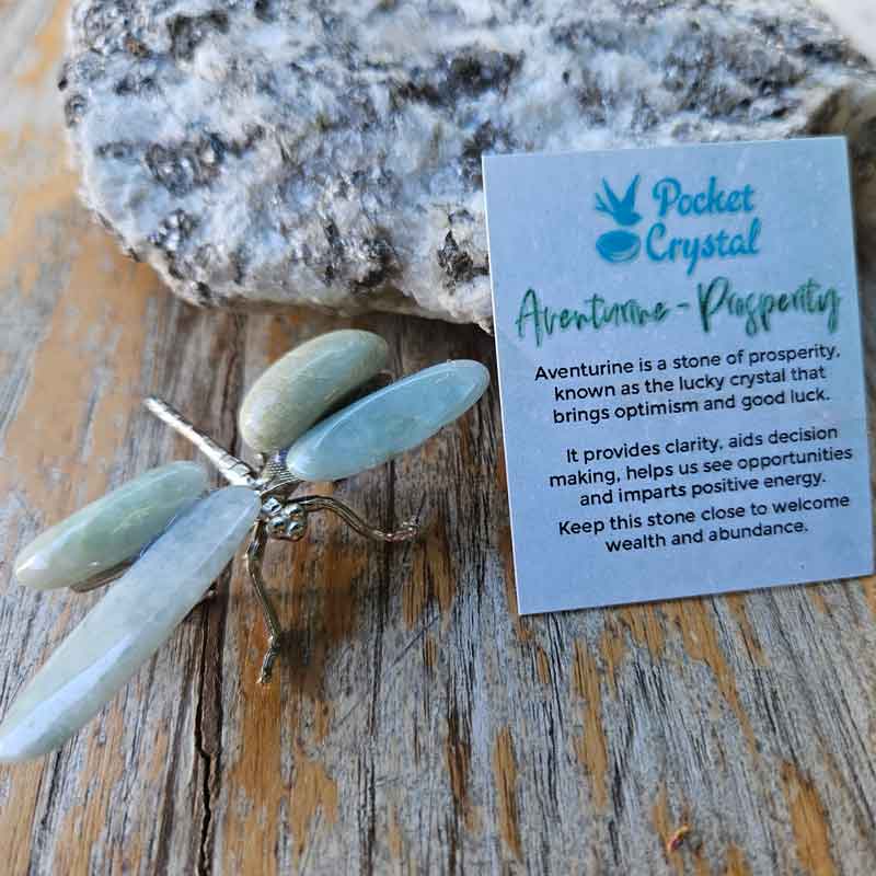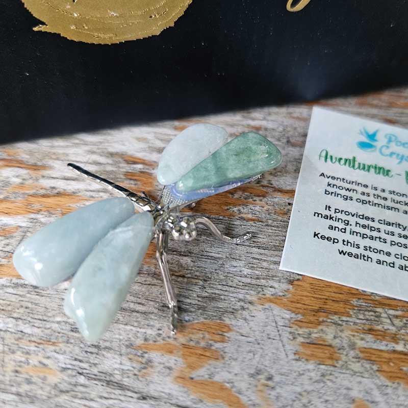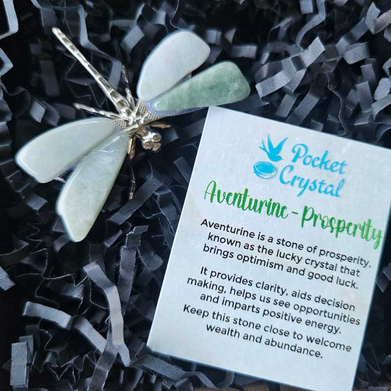- Includes aventurine dragonfly crystal, card with crystal properties and meaning and gift box.