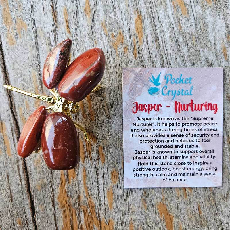 - Includes red jasper dragonfly crystal, card with crystal properties and meaning and gift box.