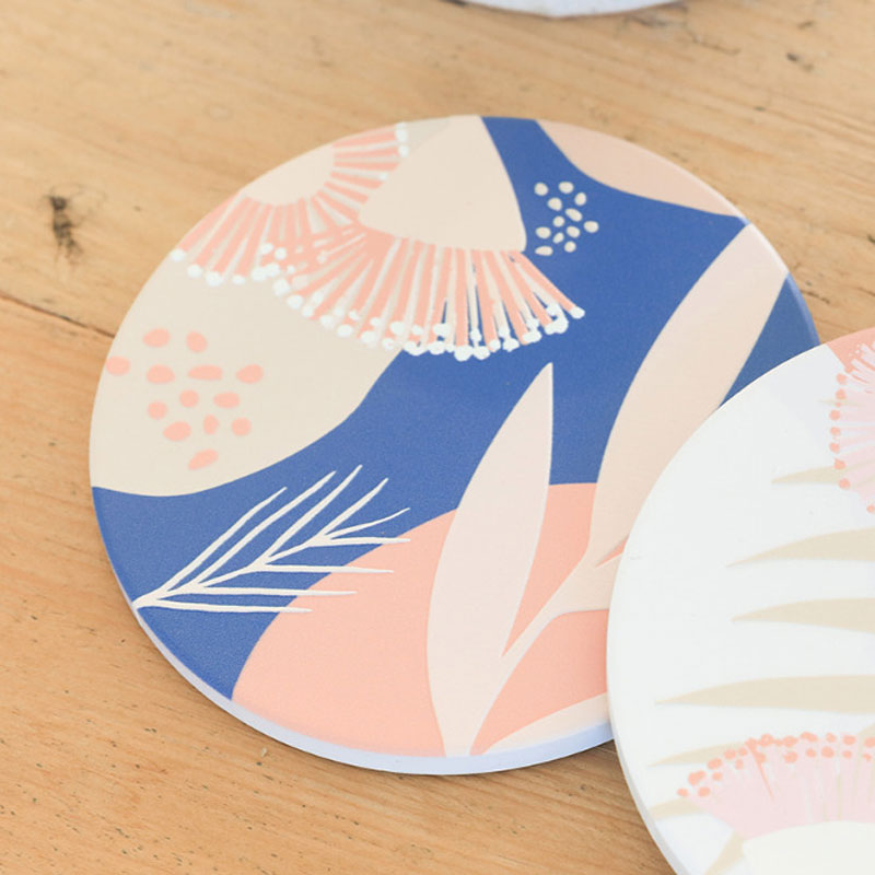 This ceramic coaster is a stunning take on the ever-popular Australiana theme featuring incredible native Australian floral illustrations with accentuating splashes of navy against a contrasting backdrop of peachy, apricot and earth tones. Colourful and pretty, this is a highly decorative but also highly functional coaster that will protect table top surfaces in style.
