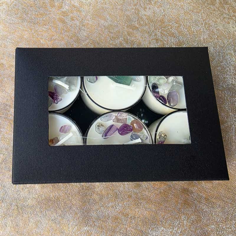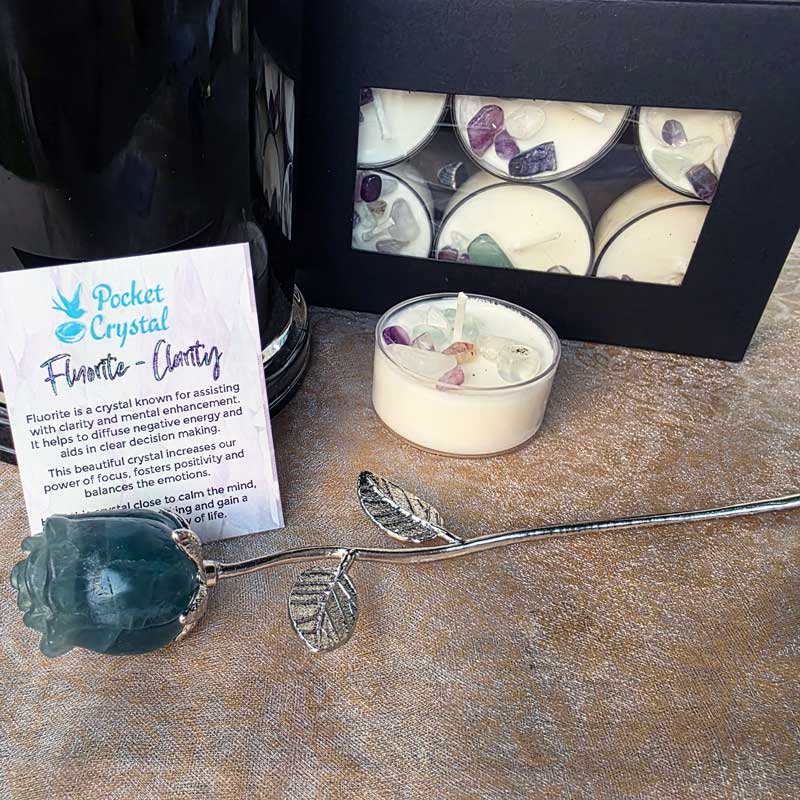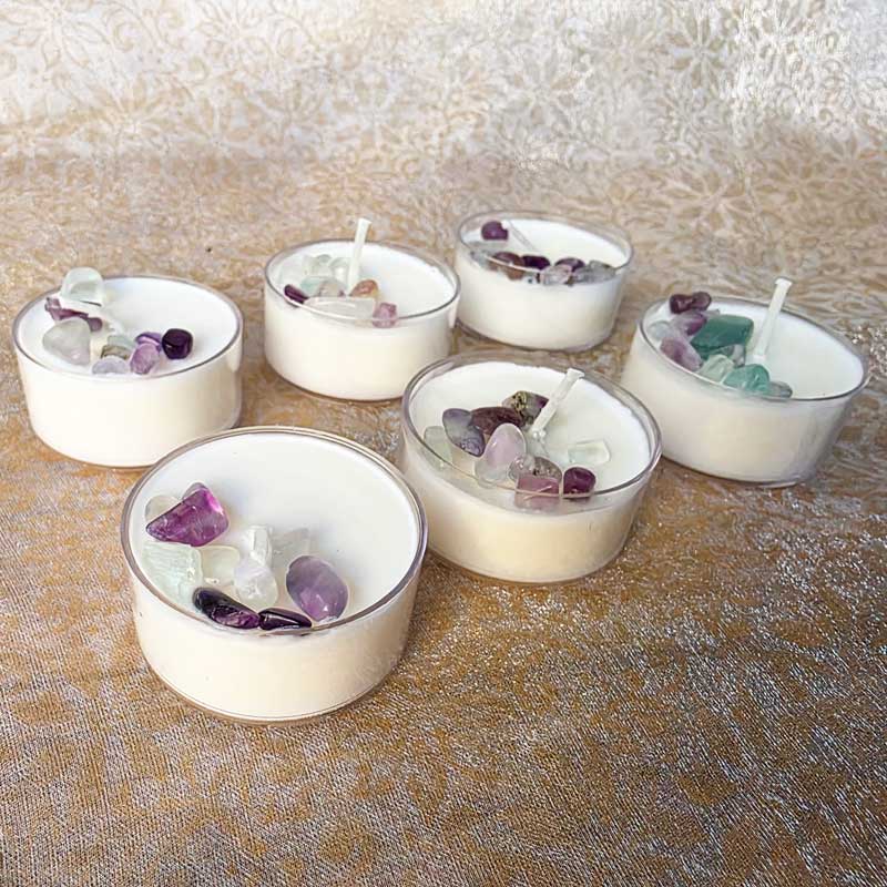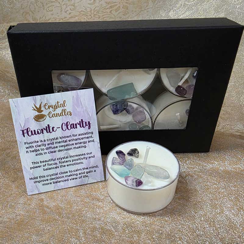 This Set of 6 Fluorite Crystal Soy Tealight Candles combine the perfect mix of stunning fragrance with healing crystals. Not only do these tealight candles smell amazing, but each tealight also contains fluorite crystals, perfect for anyone that loves the healing power of crystals.