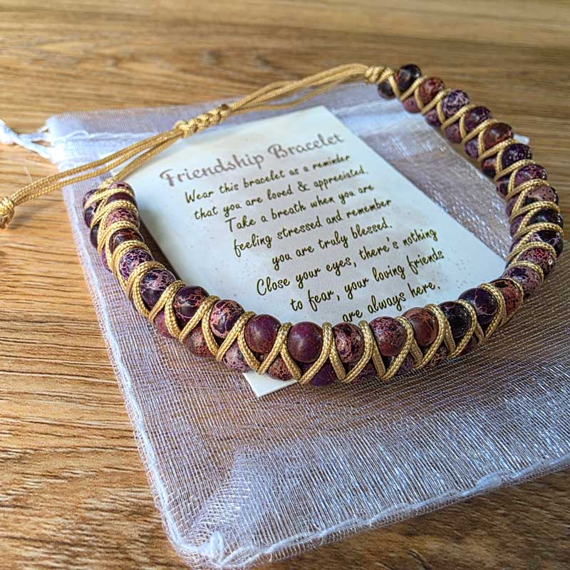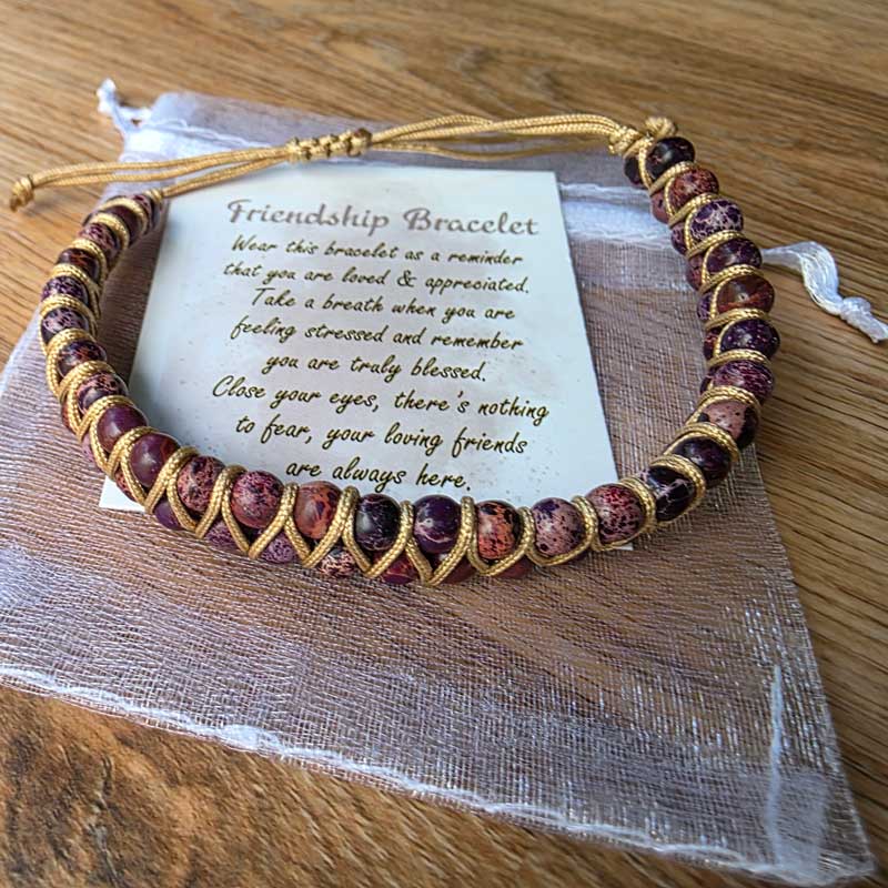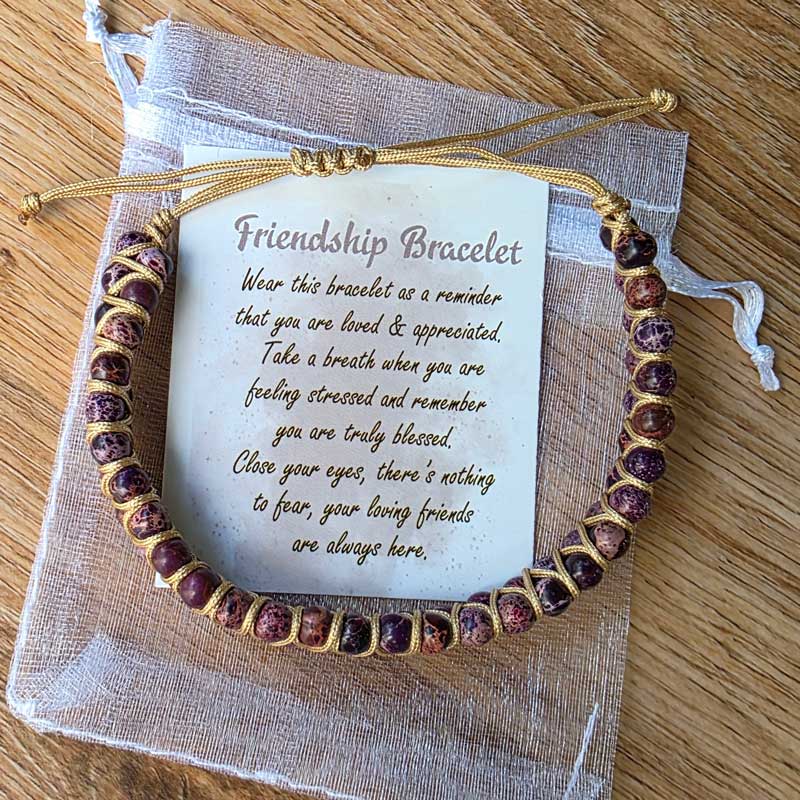 The words on the included affirmation card are: "Wear this bracelet as a reminder that you are loved and appreciated. Take a breath when you are feeling stressed and remember you are truly blessed. Close your eyes there's nothing to fear, your loving friends are always here".