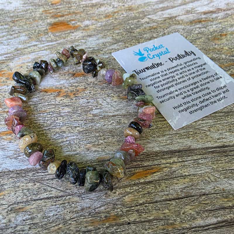 A beautiful bracelet featuring multicolour tourmaline crystal chip stones. There is nothing like wearing natural stone and these bracelets work perfectly on their own, or layered into beautiful stacks to create a more dramatic look.