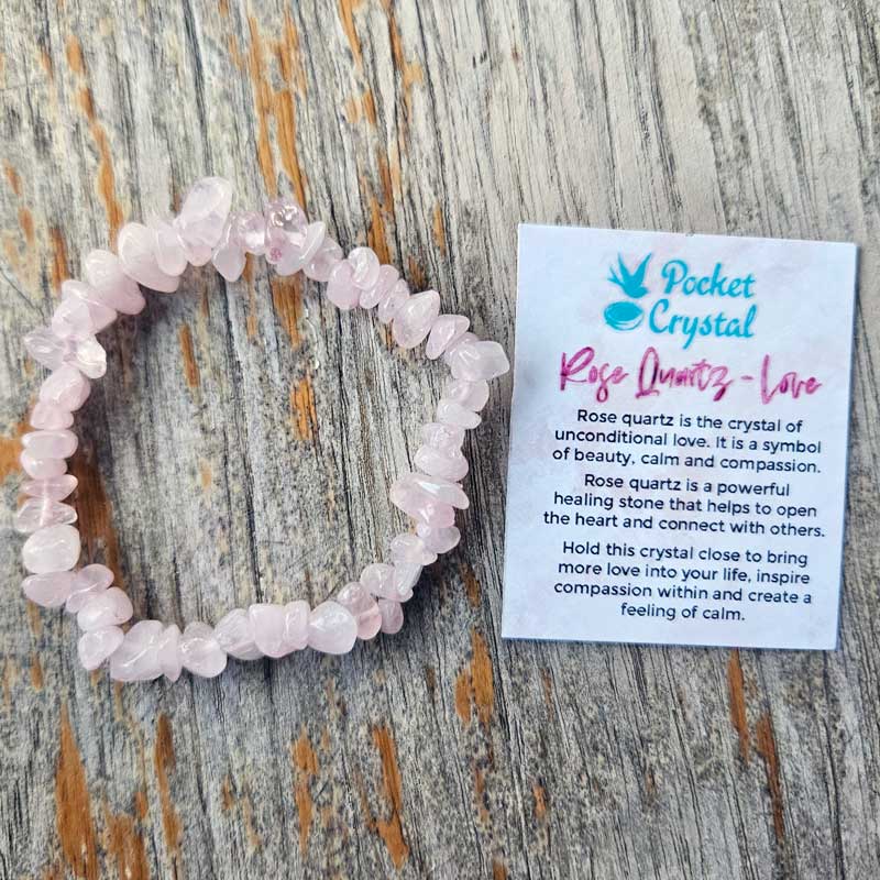 A beautiful bracelet featuring rose quartz crystal chip stones. These bracelets work perfectly on their own, or layered into beautiful stacks to create a more dramatic look.