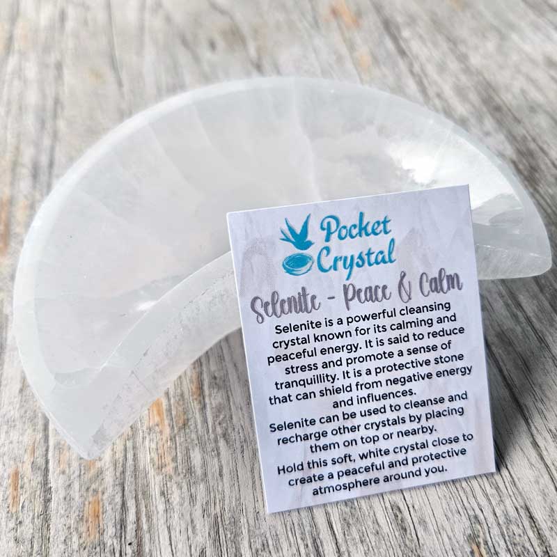 - Includes selenite moon trinket dish, crystal card with crystal properties and meaning