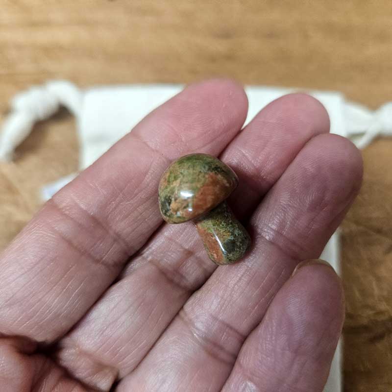 - Includes unakite mushroom crystal, card with crystal properties and meaning and fabric drawstring bag.