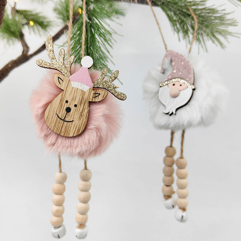 Fluffy Santa Ornament With Beads & Bells - Pink