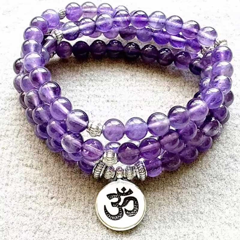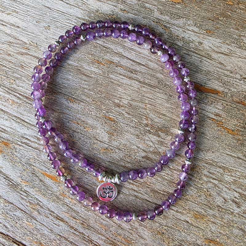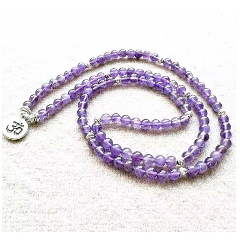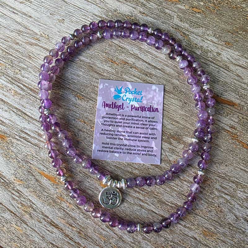 A beautiful bracelet featuring amethyst crystal stones. This stunning mala bracelet has a length of approximately 60cm, which can be looped 3 to 4 times around the wrist, used as a necklace or as a hanging ornament.