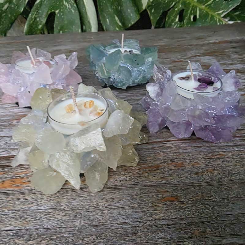 Includes a uniquely handcrafted crystal tealight candle holder and a card with the crystal's unique meaning and properties.