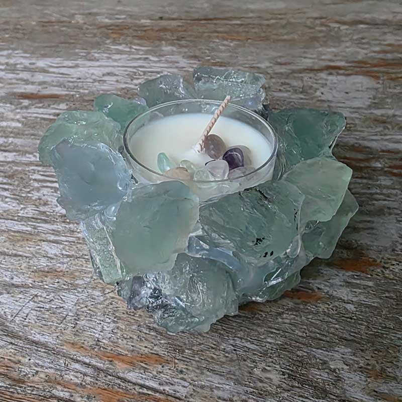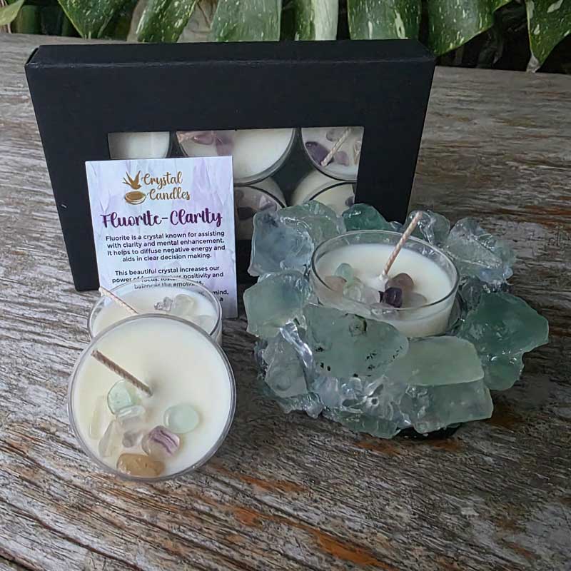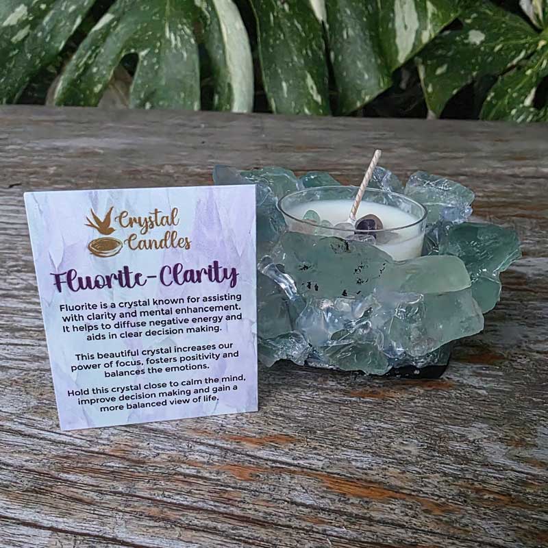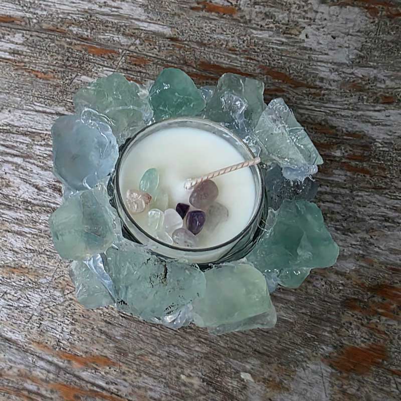 - Includes Fluorite crystal tealight candle holder and card with crystal properties and meaning
