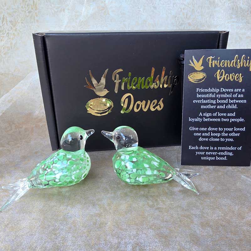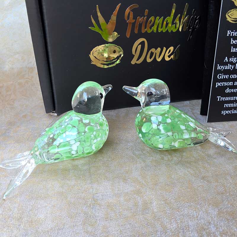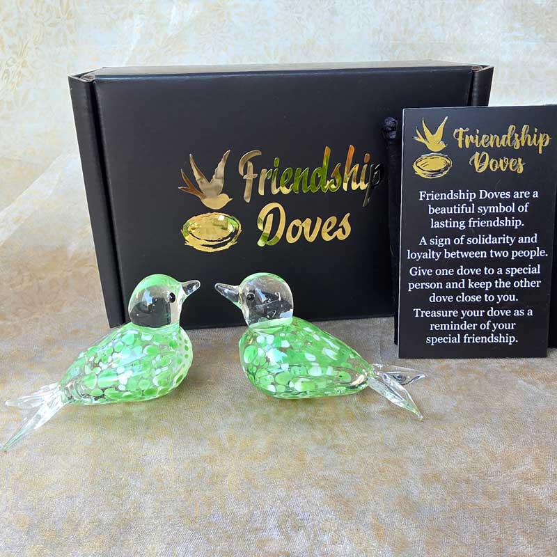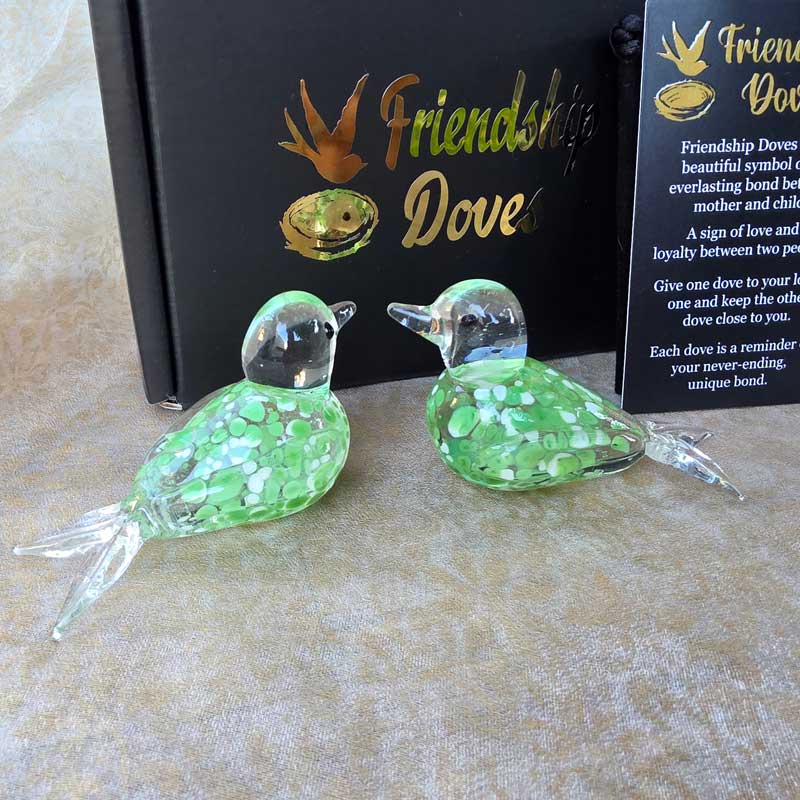 - Includes 2 x glass handmade friendship doves in gift box nest, 2 x affirmation cards & pouch for 2nd dove