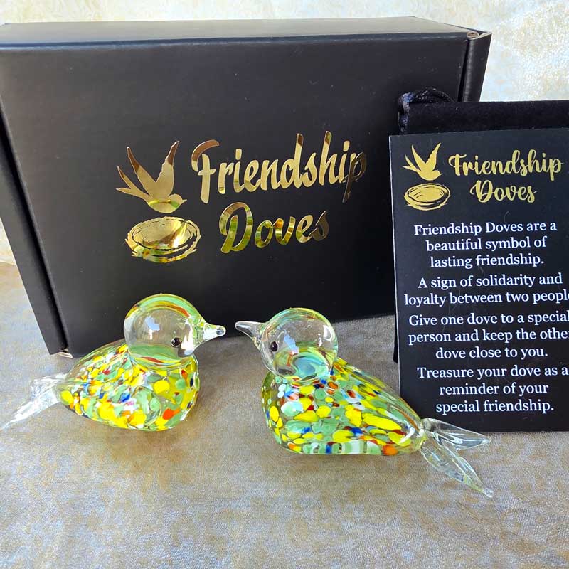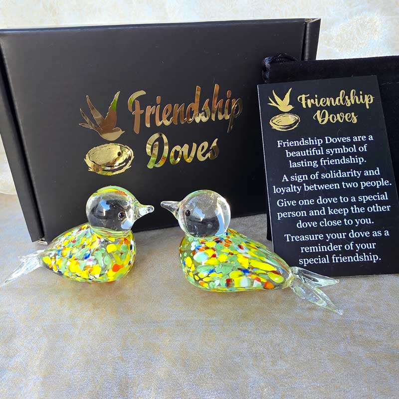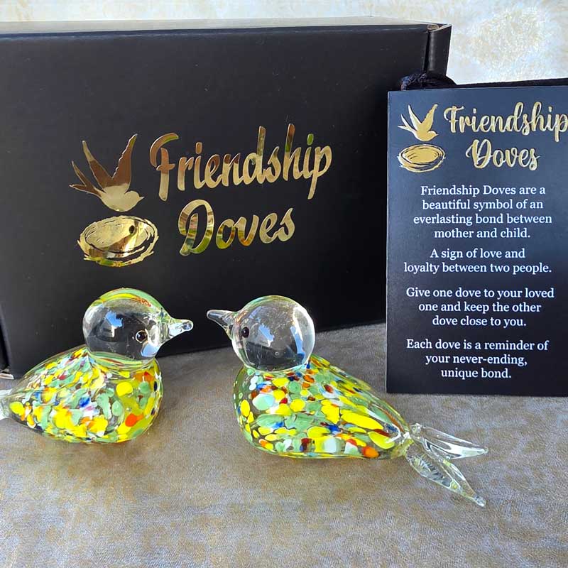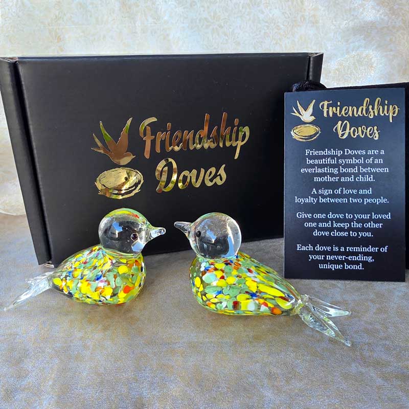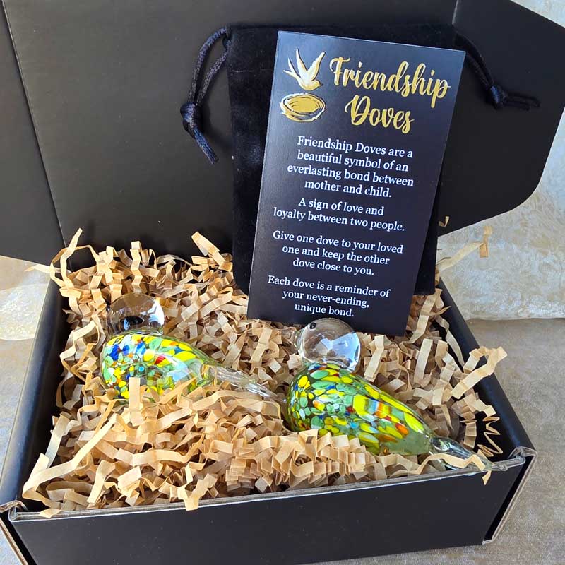 - Includes 2 x glass handmade friendship doves in gift box nest, 2 x affirmation cards & pouch for 2nd dove