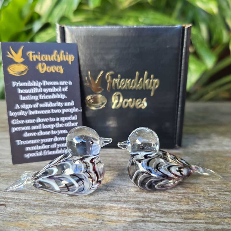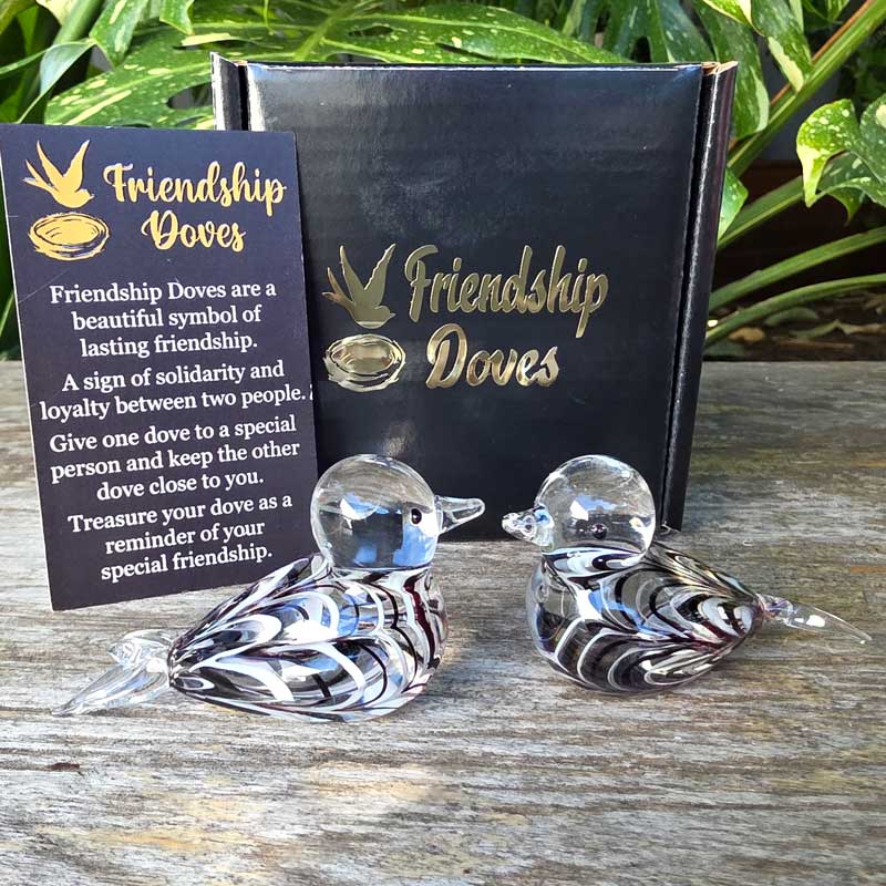 - Includes 2 x glass handmade friendship doves in gift box nest, 2 x affirmation cards & velvet pouch for 2nd dove