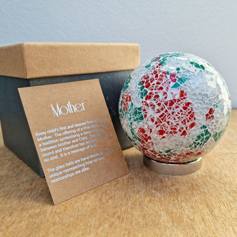 "Every child's first and dearest friend is their Mother. The offering of a Friendship Ball is a tradition symbolising a deep connection between Mother and Child. The ball is round and therefore has no beginning and no end. It is a message of love. The glass balls are hand blown and each is unique representing how no two relationships are alike."