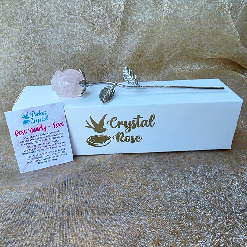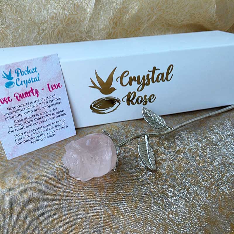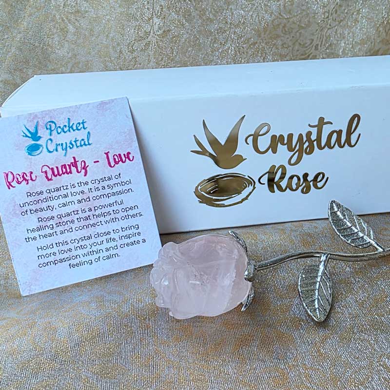 Includes a crystal & metal rose and a card with the crystal's unique meaning and properties.