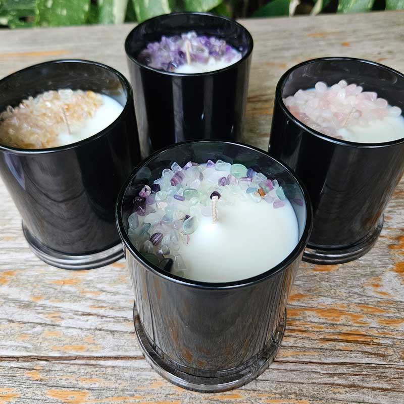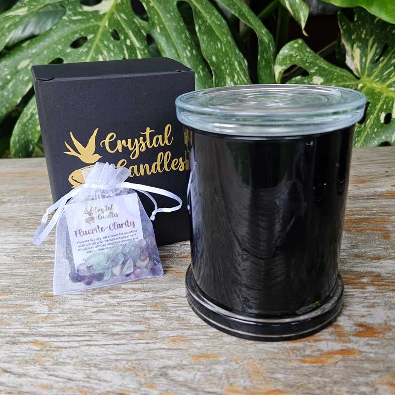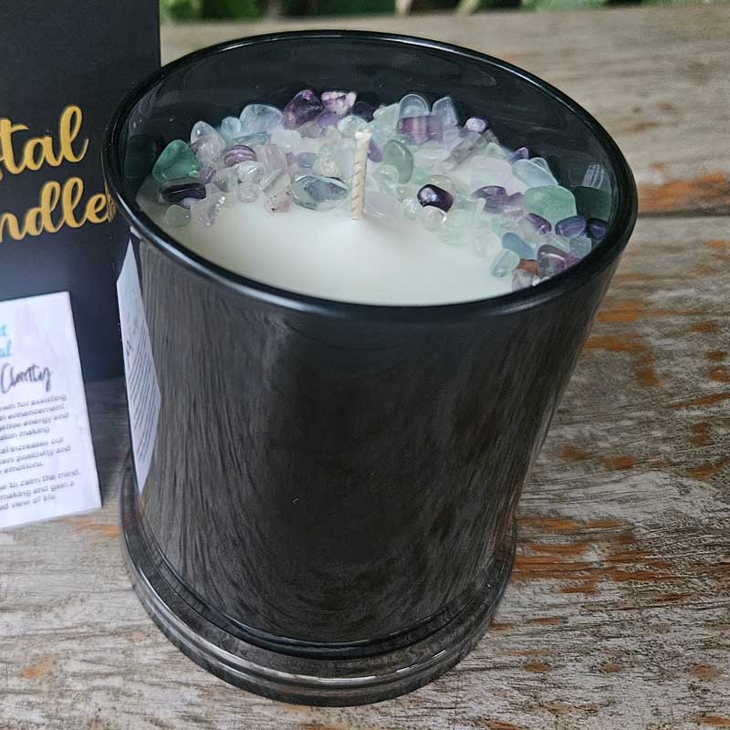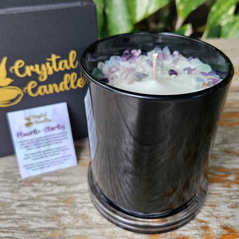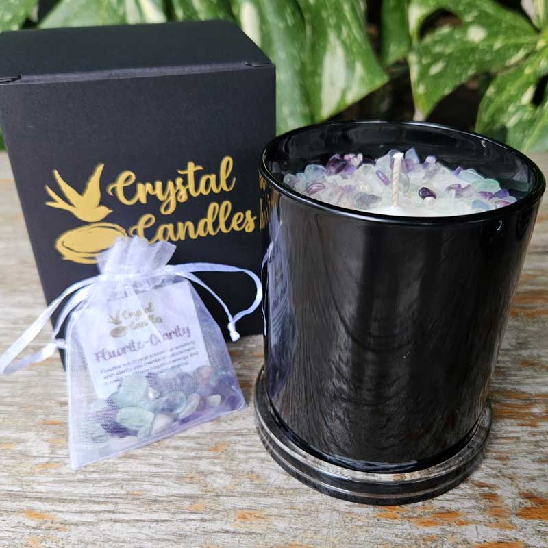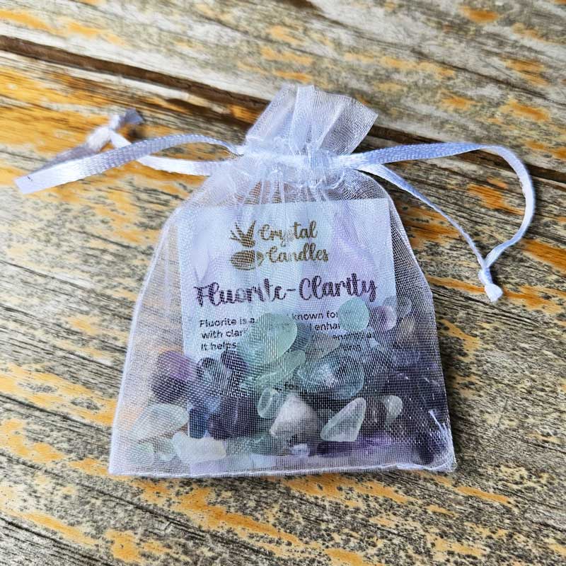 - Contains fluorite crystals, crystal meaning card and drawstring organza bag to store the card and crystals once the candle has fully burned.