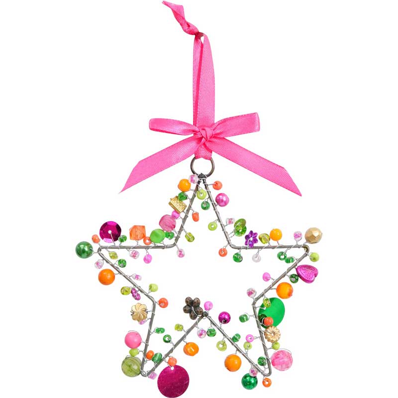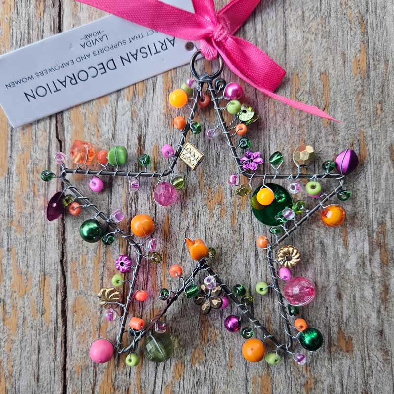 A stunning uniquely handmade hanging star ornament in pretty pink tones. Crafted from small beads and bells around a wire star shape. This heart is handmade by Artisan Decoration, a project that supports and empowers women.