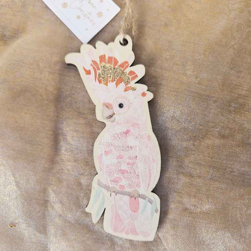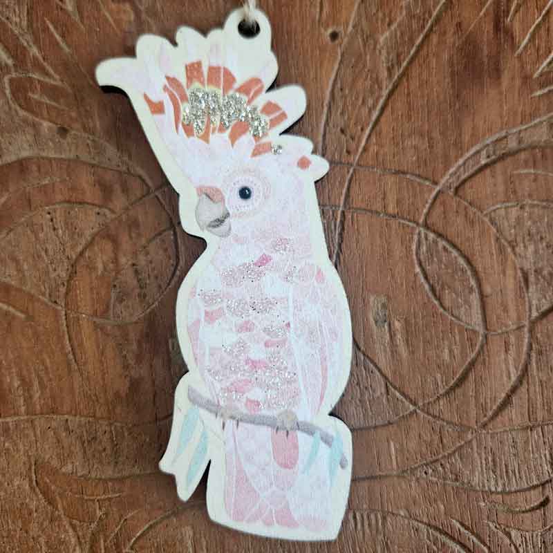 A lovely hanging Major Mitchell's Cockatoo tree ornament in a cutout design. Designed by Australia artist Frankie B.