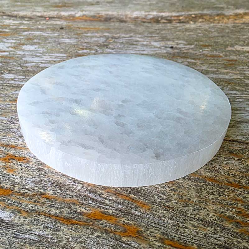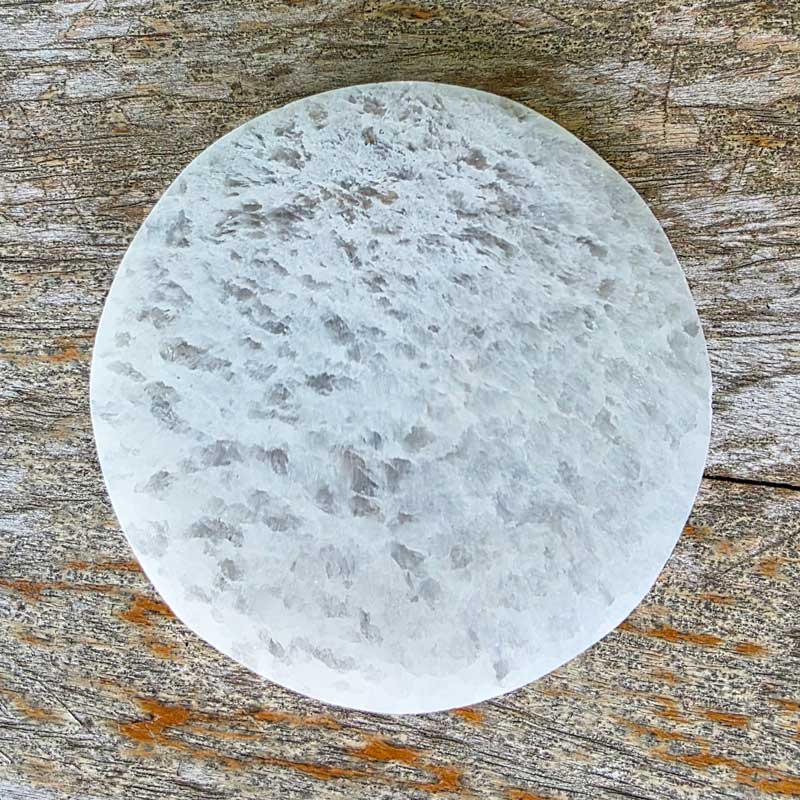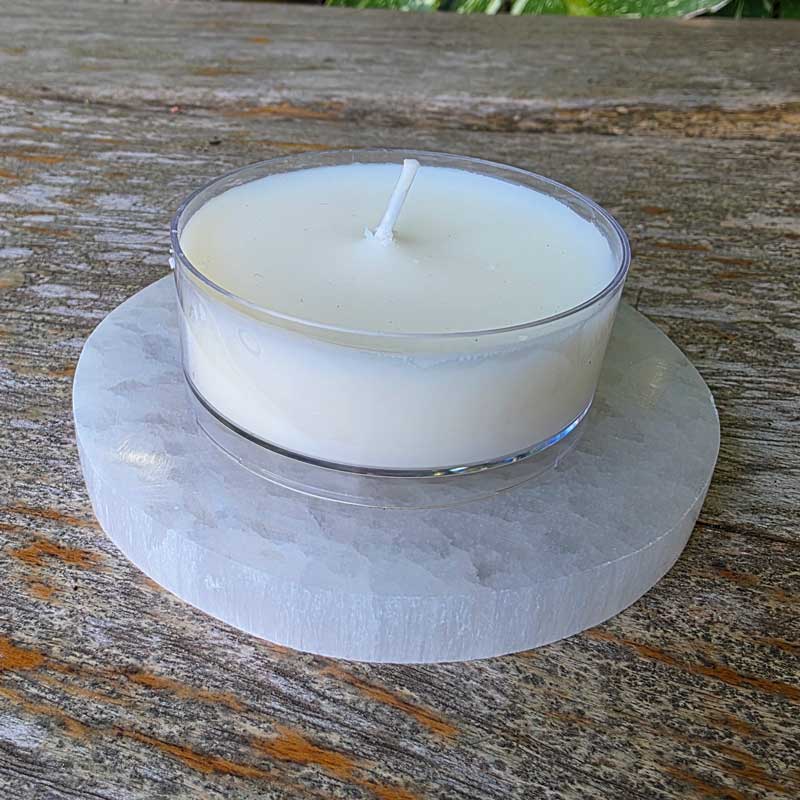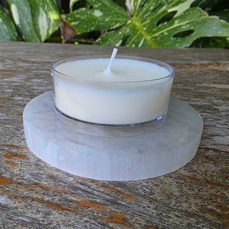 This beautiful crystal candle plate has been crafted from selenite and is perfect for placing a maxi tealight candle on top.