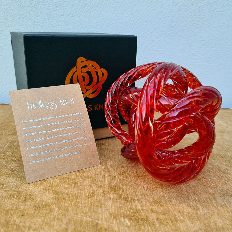 Show someone how much you care with the unique gift of an Endless Knot! This stunning Endless Knot has been hand made and mouth blown to create a one of a kind piece, perfect for a one of a kind friend, family member, partner or loved one!