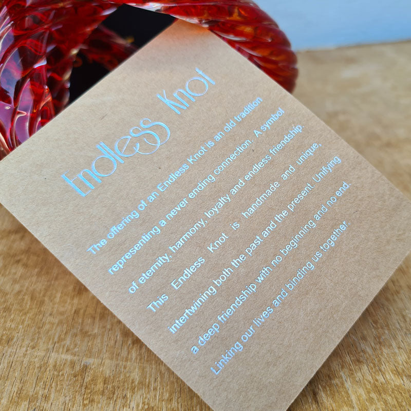 "The offering of an Endless Knot is an old tradition representing a never ending connection. A symbol of eternity, harmony, loyalty and endless friendship. This Endless Knot is handmade and unique, intertwining both the past and the present. Unifying a deep friendship with no beginning and no end. Linking our lives and binding us together."