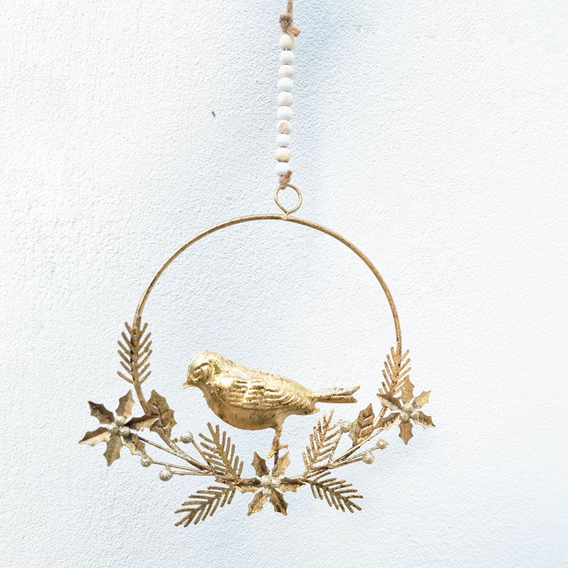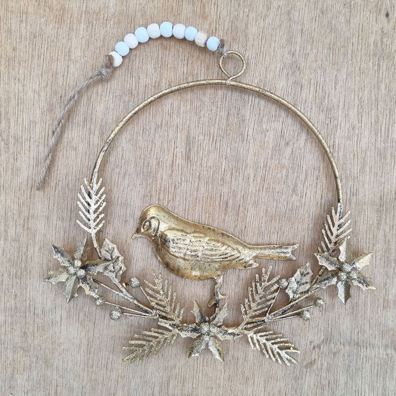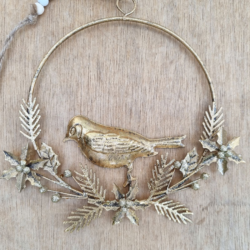 This charming hanging metal bird wreath will add charm to your Christmas setting.