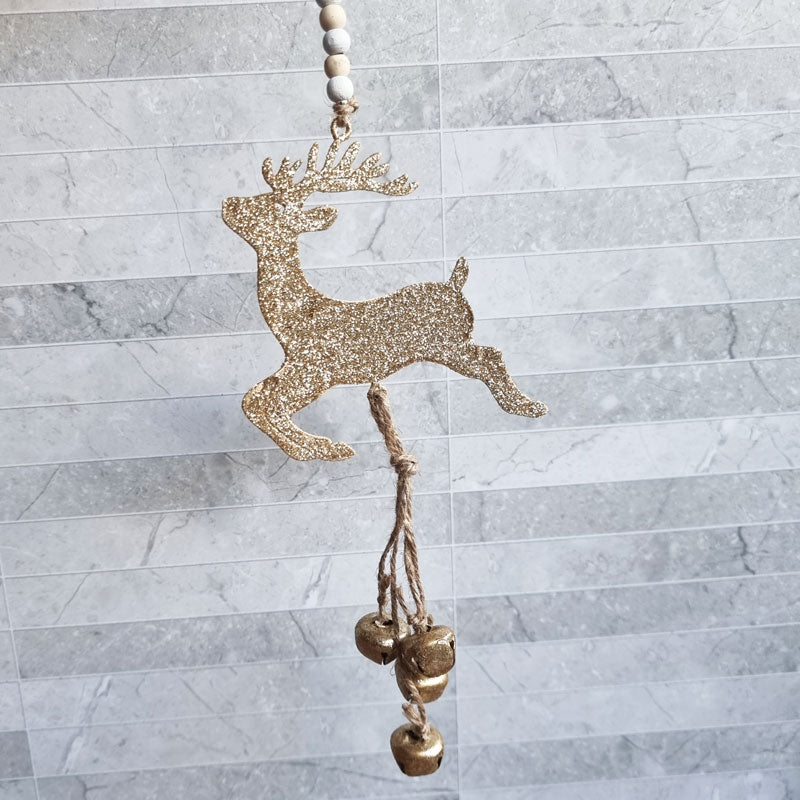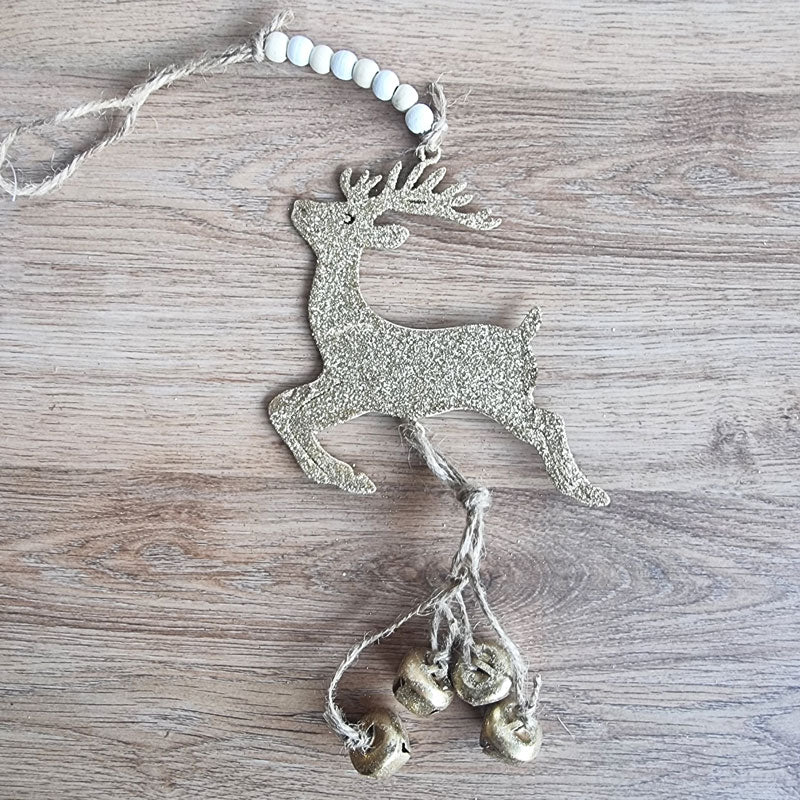 A cute hanging reindeer ornament in glittery gold with 4 hanging jingle bells.