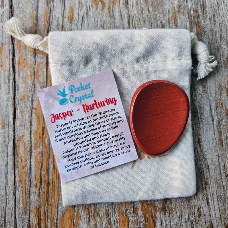 - Includes jasper worry stone oval shaped crystal, card with crystal properties and meaning and fabric drawstring bag.