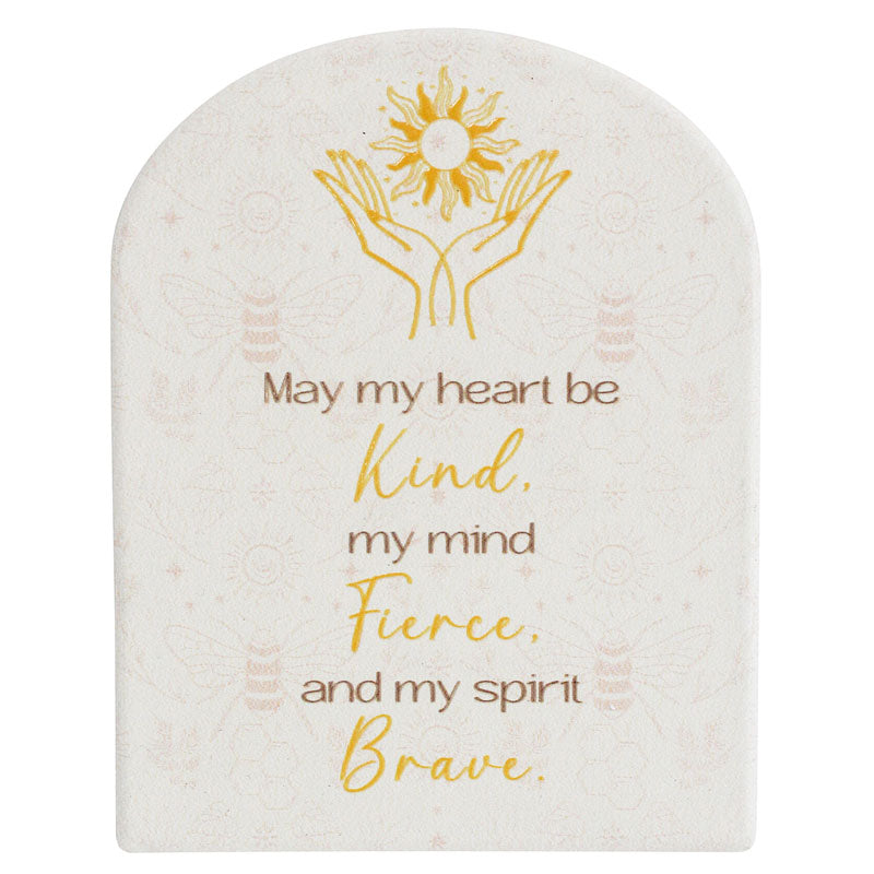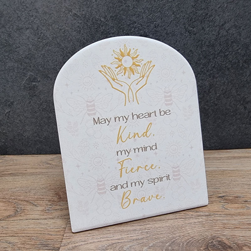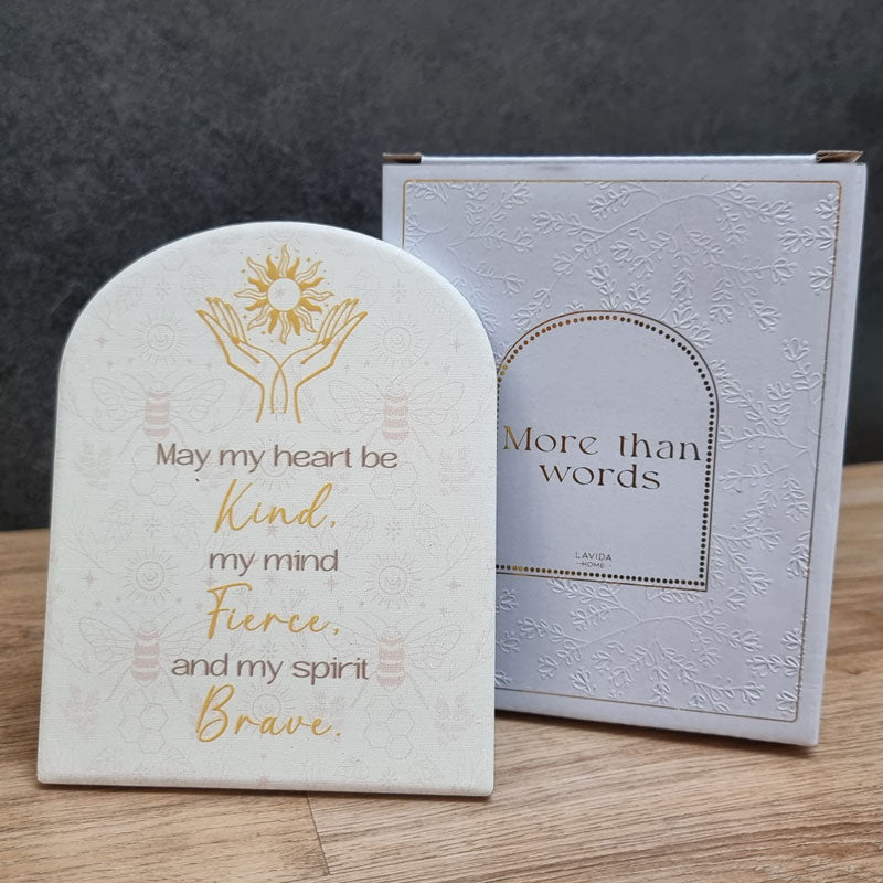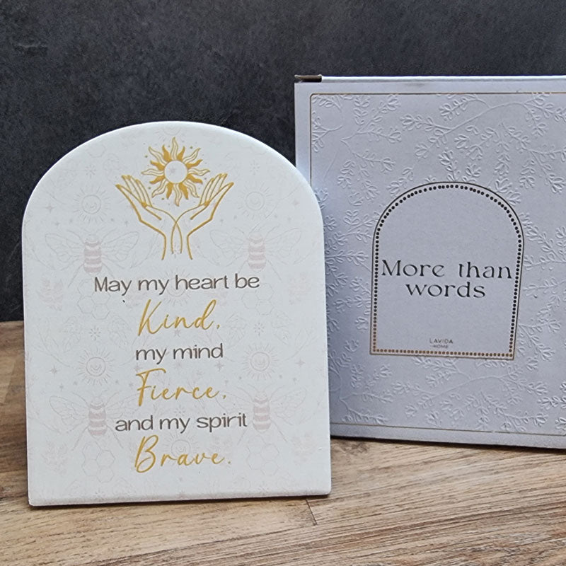 This standing ceramic plaque features the inspirational words "May my heart be kind, my mind fierce and my spirit brave". Comes gift boxed so is the perfect gift idea or inspo gift to yourself. Perfect for an office desktop or bedside table.