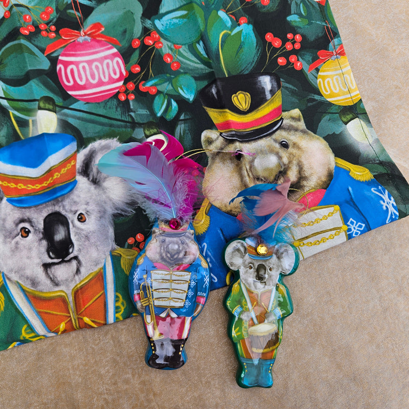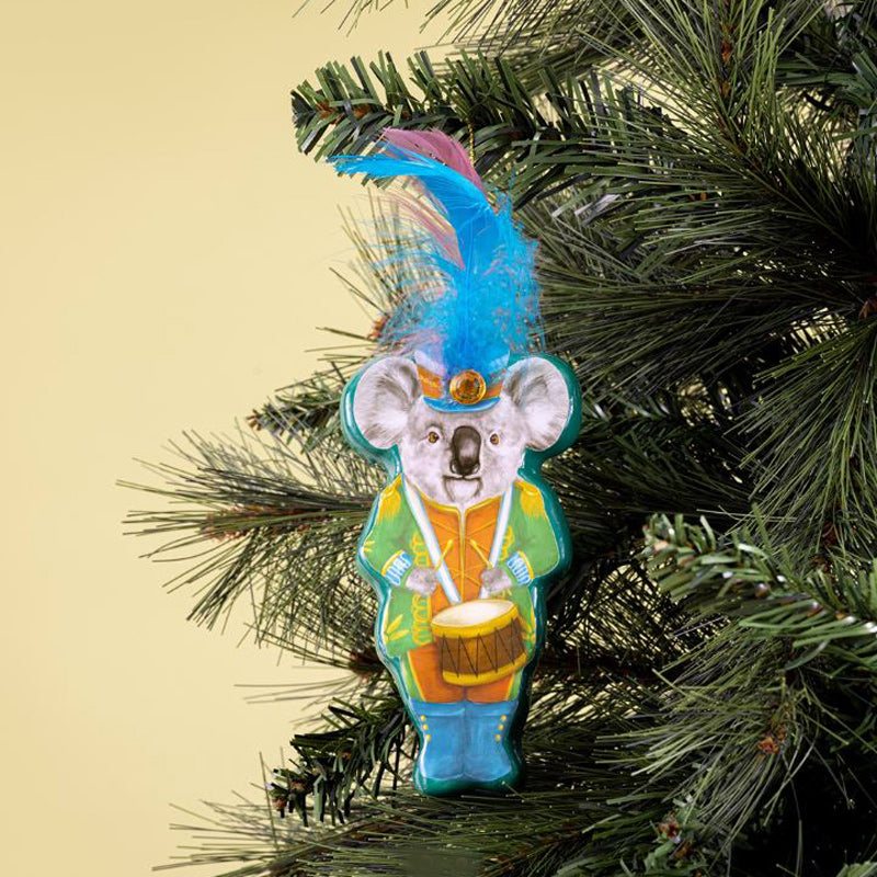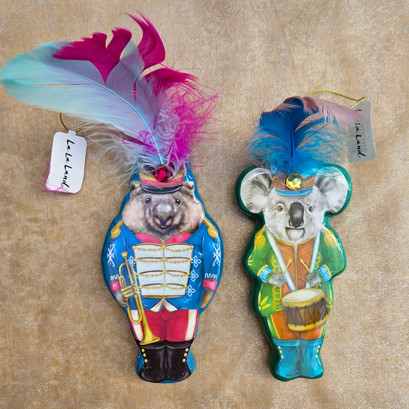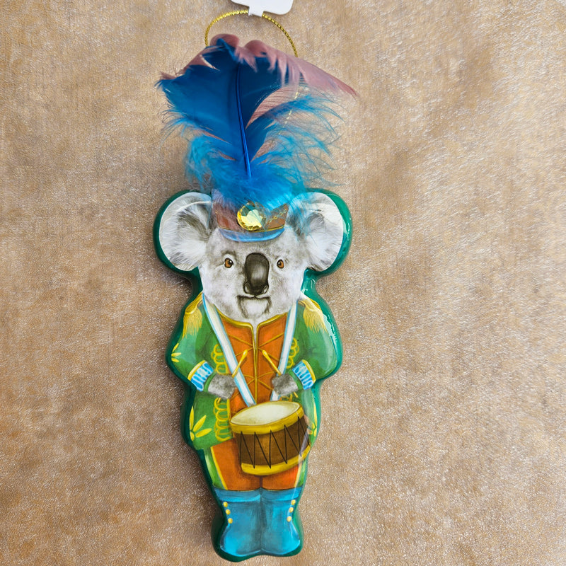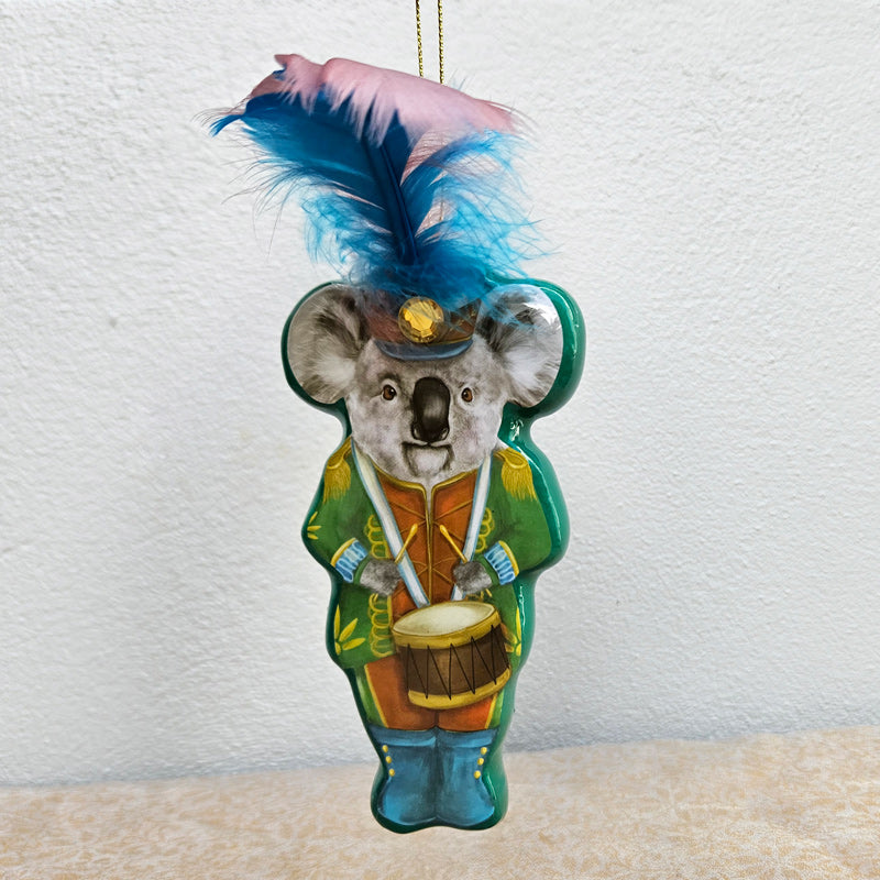A super cute nutcracker koala Christmas bauble! Features feathers in the cap for extra detail.