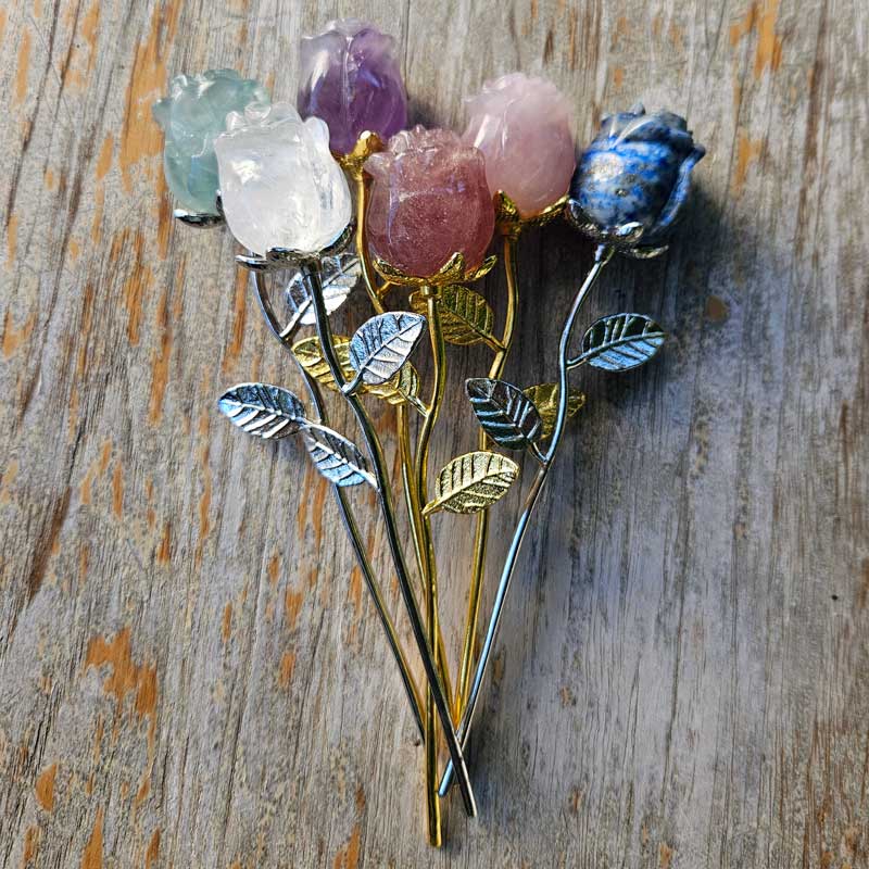 Includes a crystal & metal rose and a card with the crystal's unique meaning and properties.