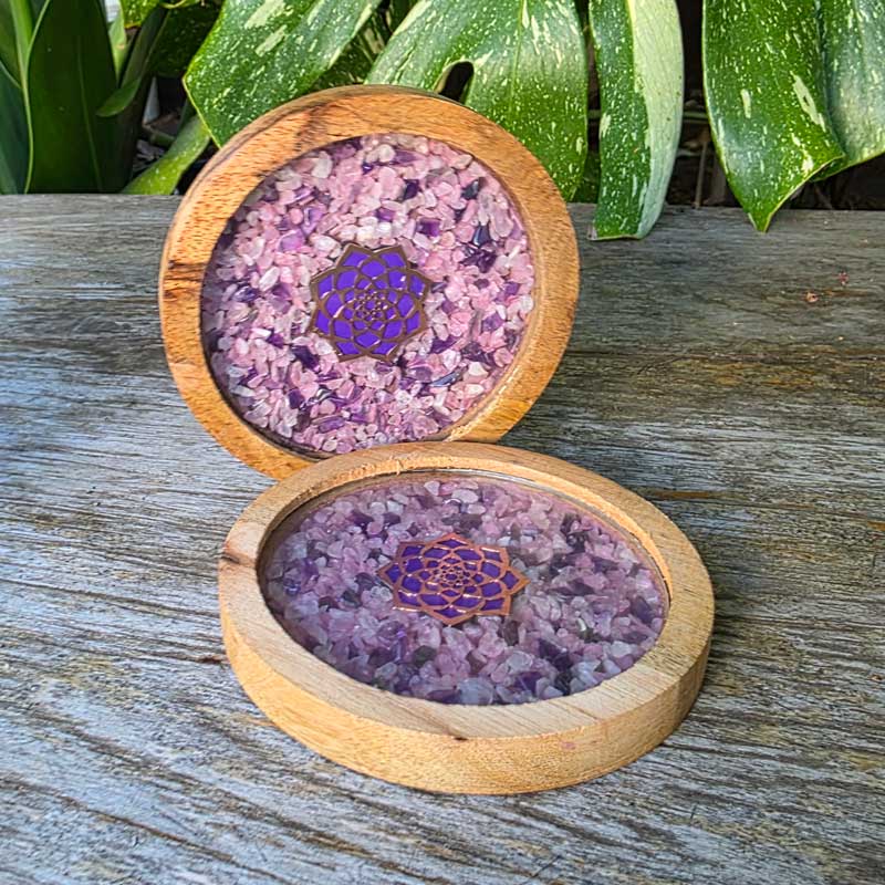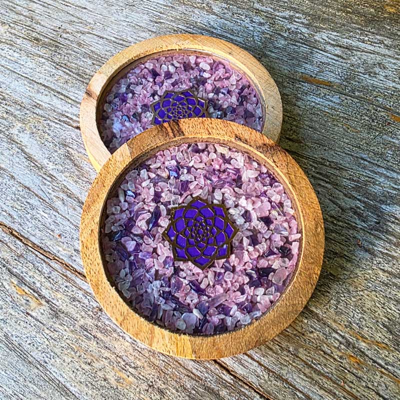 This beautiful coaster set features inlaid rose quartz and amethyst stones, with a lotus flower in the centre. Includes two coasters in each set.