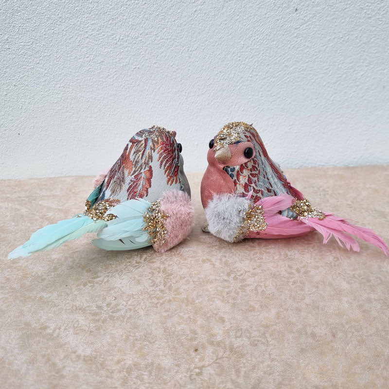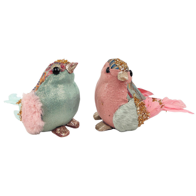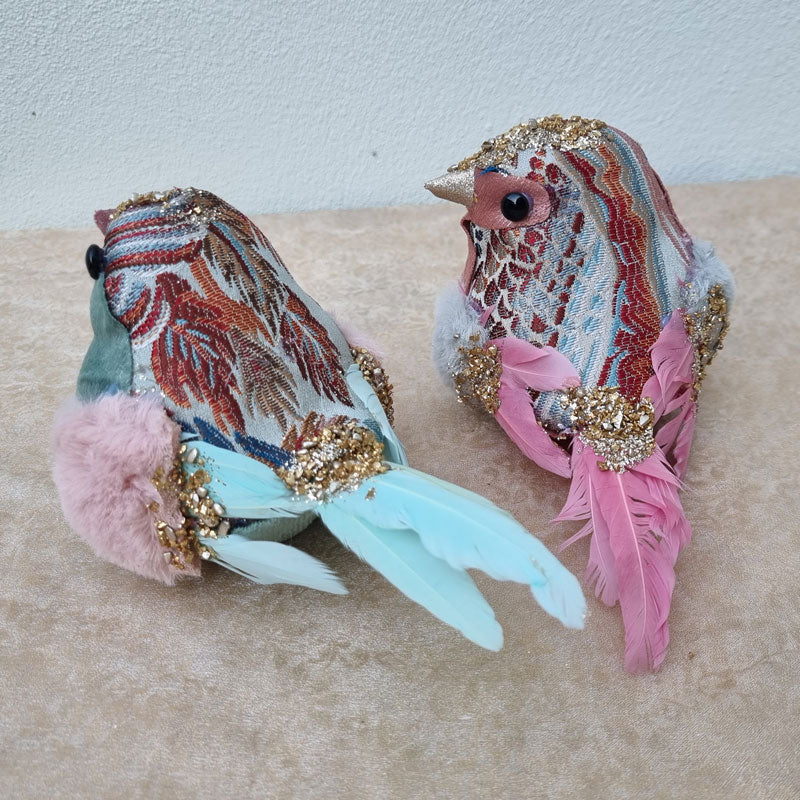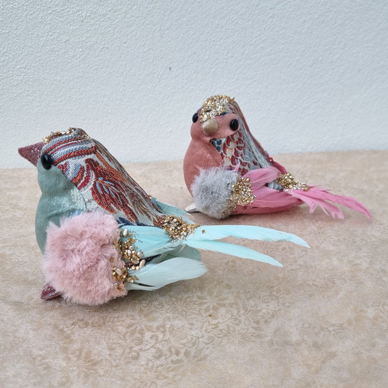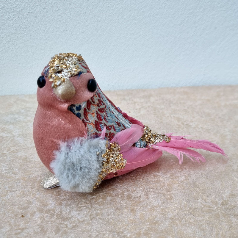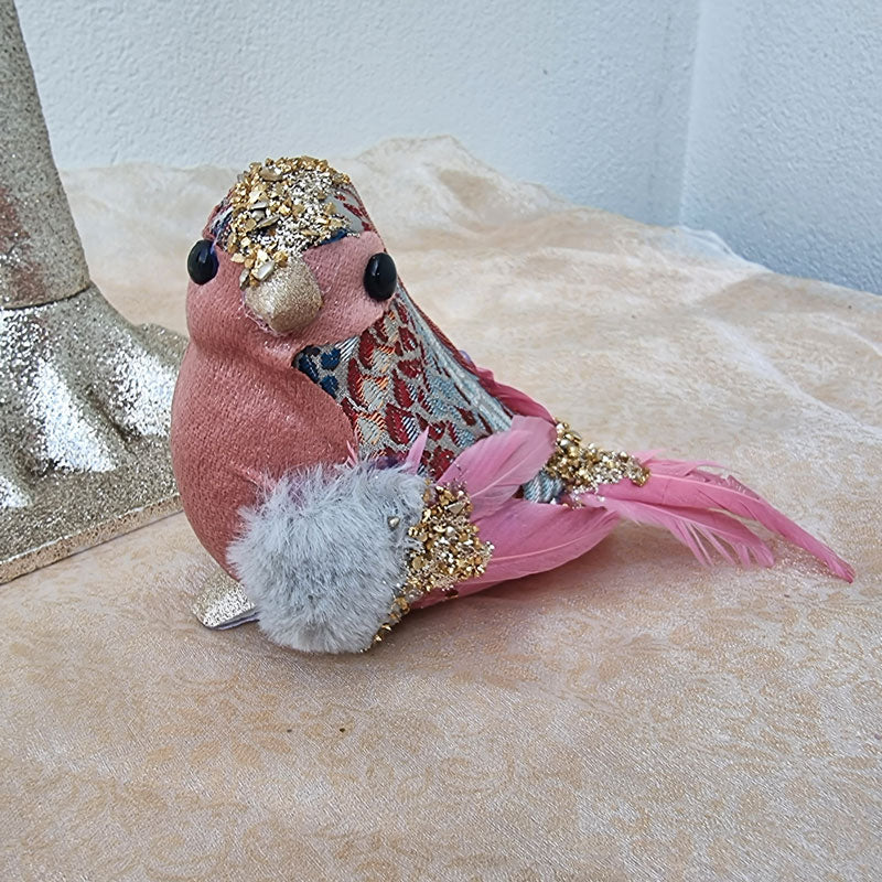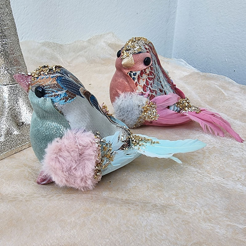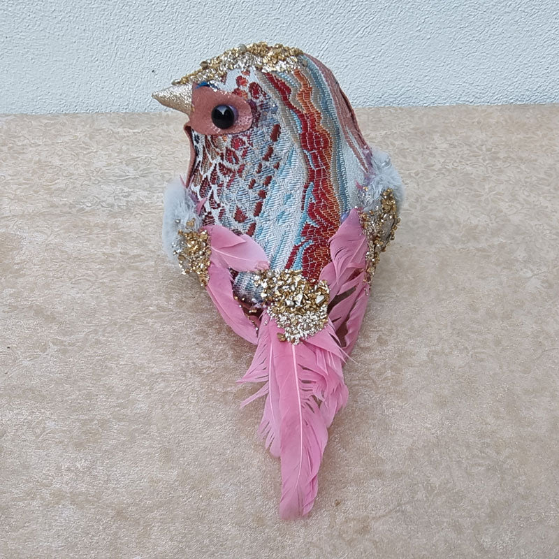This beautiful sitting bird is just stunning! Features a pretty patchwork fabric, fur, feather and sparkles. There is so much lovely detail on this ornament and it is a must for anyone that loves our feathered friends.