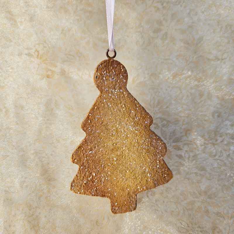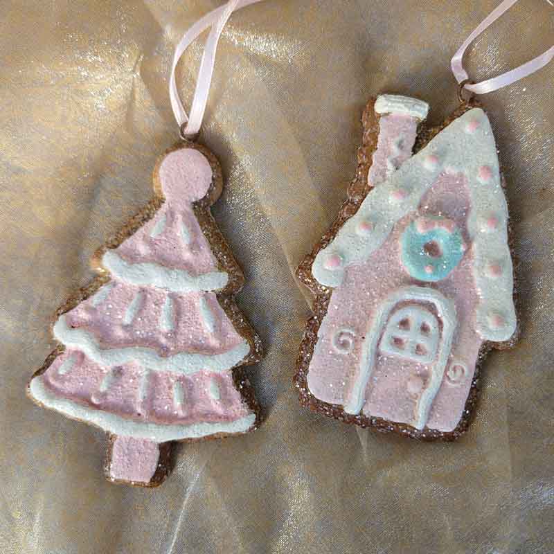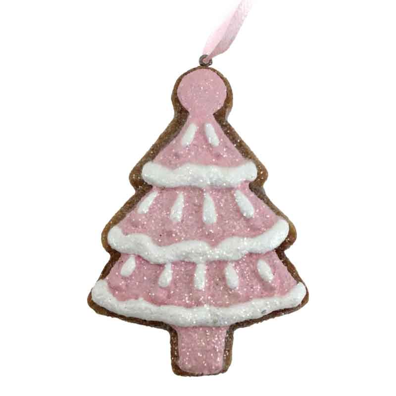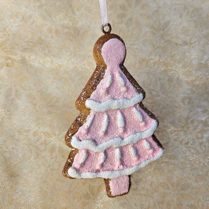 A cute hanging tree ornament in a pretty pink gingerbread design that looks good enough to eat!