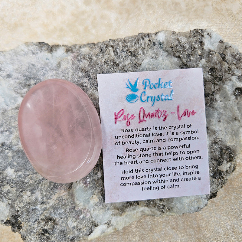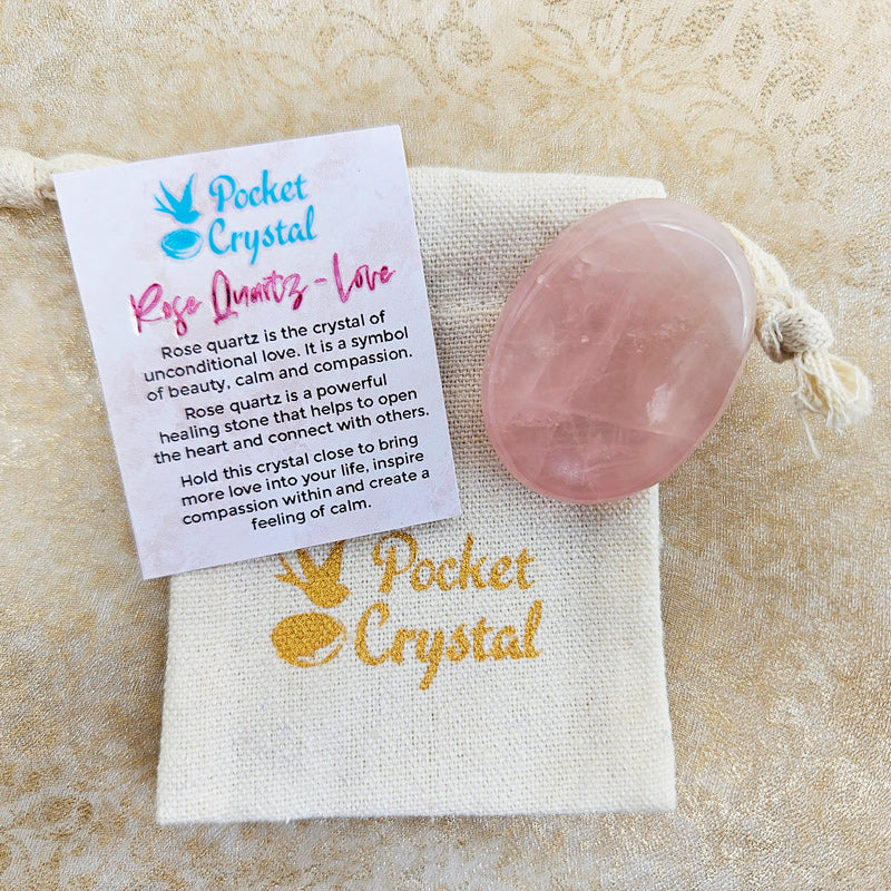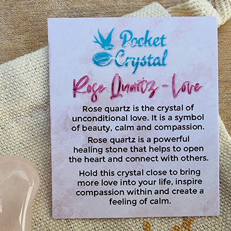 - Includes rose quartz worry stone oval shaped crystal, card with crystal properties and meaning and fabric drawstring bag.
