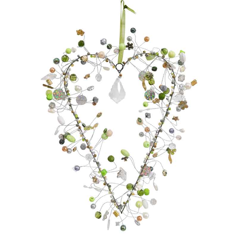 A stunning uniquely handmade hanging heart ornament in pretty shades of green. Crafted from small beads and bells around a wire heart shape. This heart is handmade by Artisan Decoration, a project that supports and empowers women.