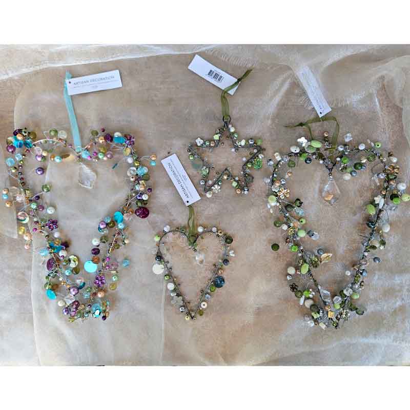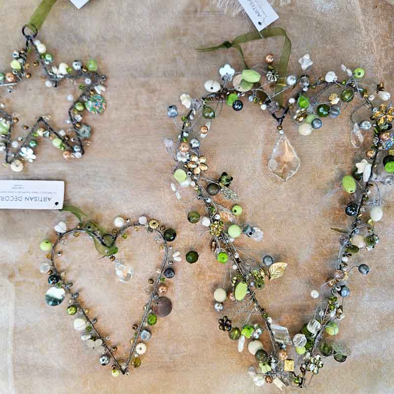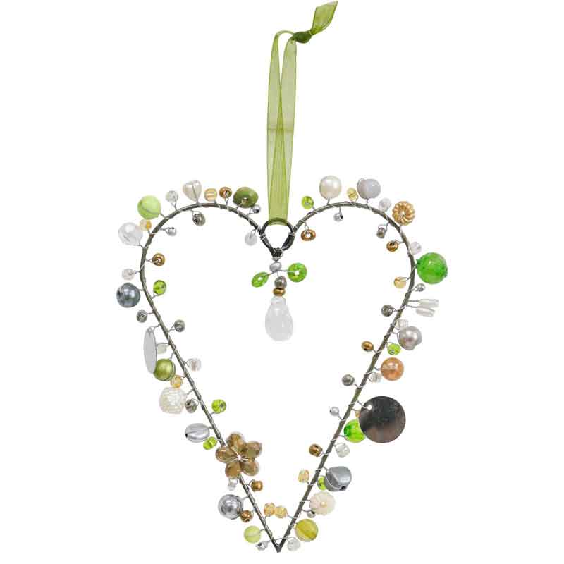 A stunning uniquely handmade hanging heart ornament in pretty shades of green. Crafted from small beads and bells around a wire heart shape. This heart is handmade by Artisan Decoration, a project that supports and empowers women.