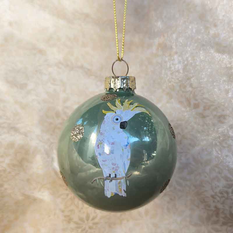 A lovely hanging Christmas bauble in an Aussie Bird design. Designed by Australia artist Frankie B. Each bauble has 3 birds featured on it - kookaburra, cockatoo and Major Mithchell's cockatoo so you can turn the bauble to whatever bird is your favourite. Makes a great gift for overseas family and friends.