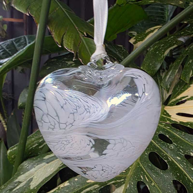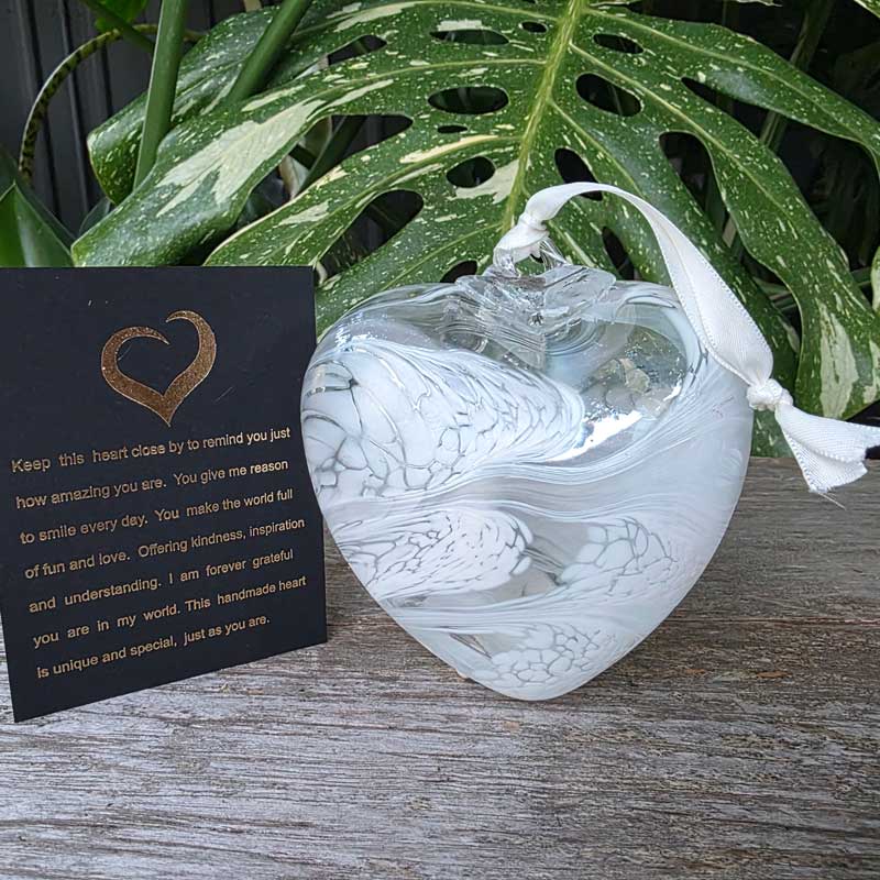 Show someone how much you care with this beautiful handmade glass heart! This stunning heart has been hand made and mouth blown to create a one of a kind piece, perfect for a one of a kind friend, family member, partner or loved one!