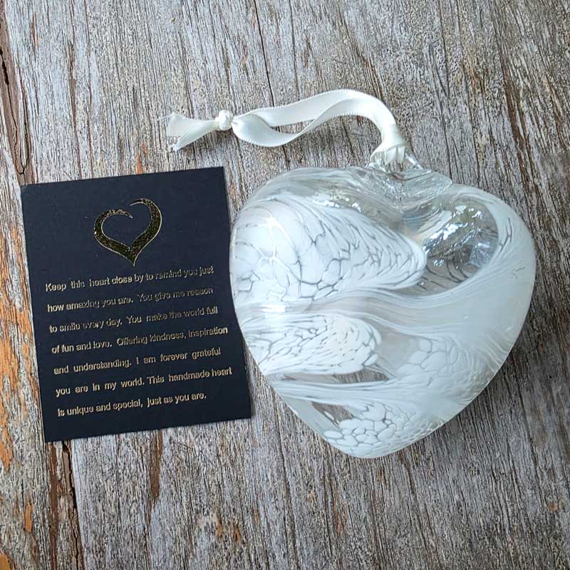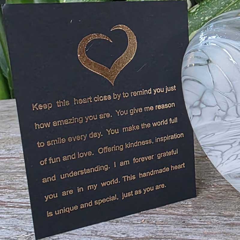 “Keep this heart close by to remind you just how amazing you are. You give me reason to smile every day. You make the world full of fun and love. Offering kindness, inspiration and understanding. I am forever grateful you are in my world. This handmade heart is unique and special, just as you are.”
