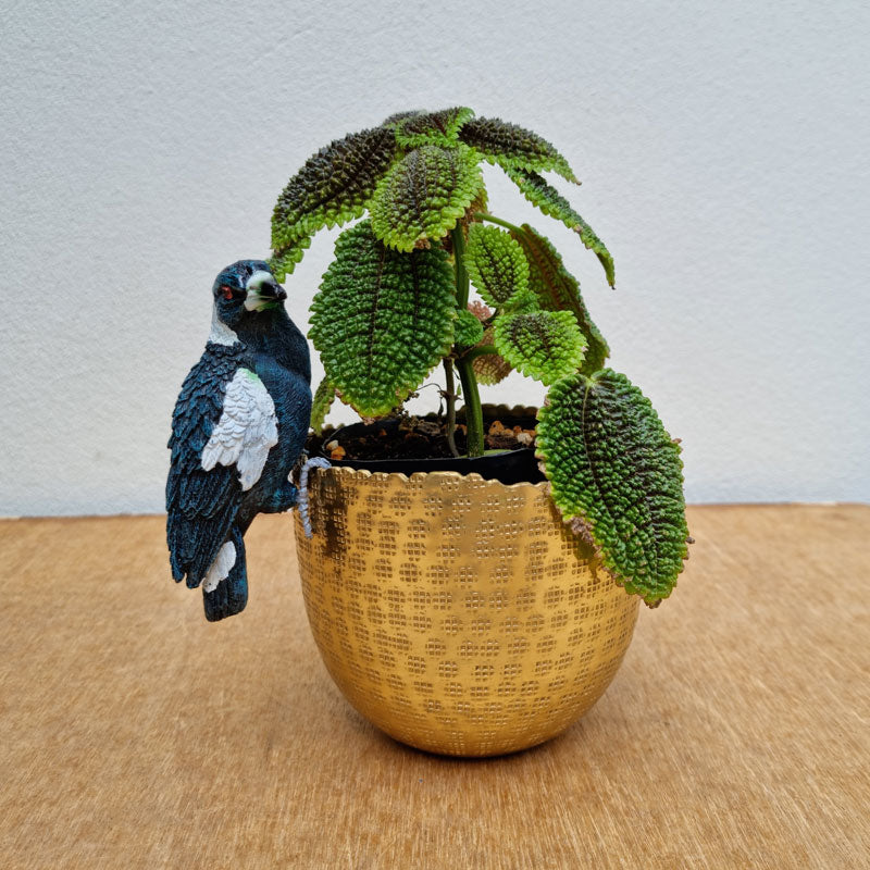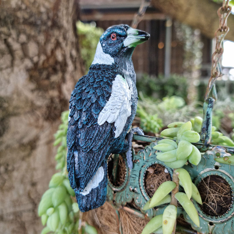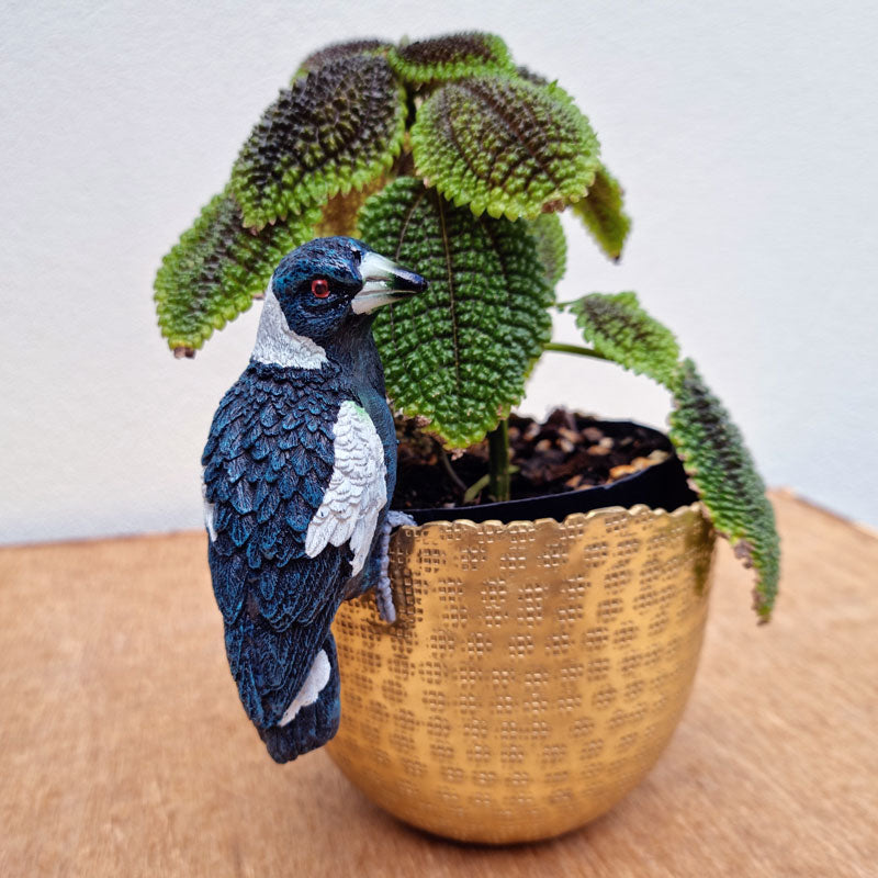 An eye catching magpie figurine that sits at the top of your pot plant., branch, vase or trellis. Adds a decorative touch to liven up your garden. The perfect little gift for any plant or bird lover or a treat for yourself.